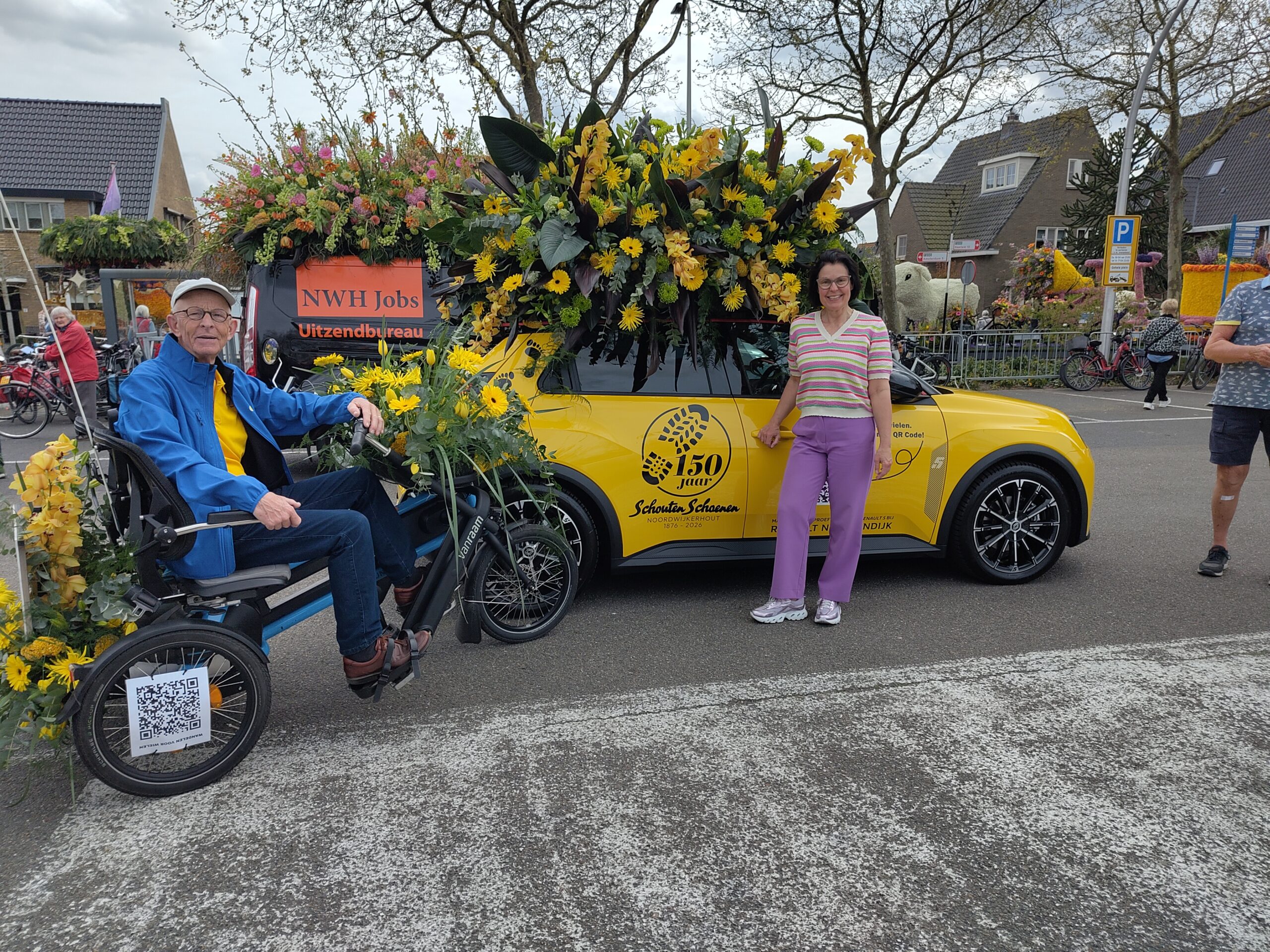 Noordwijkerhout- Schoenenwinkel Schouten Schoenen, in Noordwijkerhout, heeft het 150-jarig bestaan gevierd met een bijzondere deelname aan het bloemencorso. De versierde luxewagen van Schouten werd ondersteund door Fietsmaatjes Noordwijkerhout en wandelaar Debby Schouten, met als missie om geld in te zamelen voor een duofiets voor Fietsmaatjes Noordwijkerhout. Behalve promotie op het corso, ondersteunt zij de actie met het werven van donaties door deelname aan de Nijmeegse Vierdaagse van 4 keer 40 kilometer.