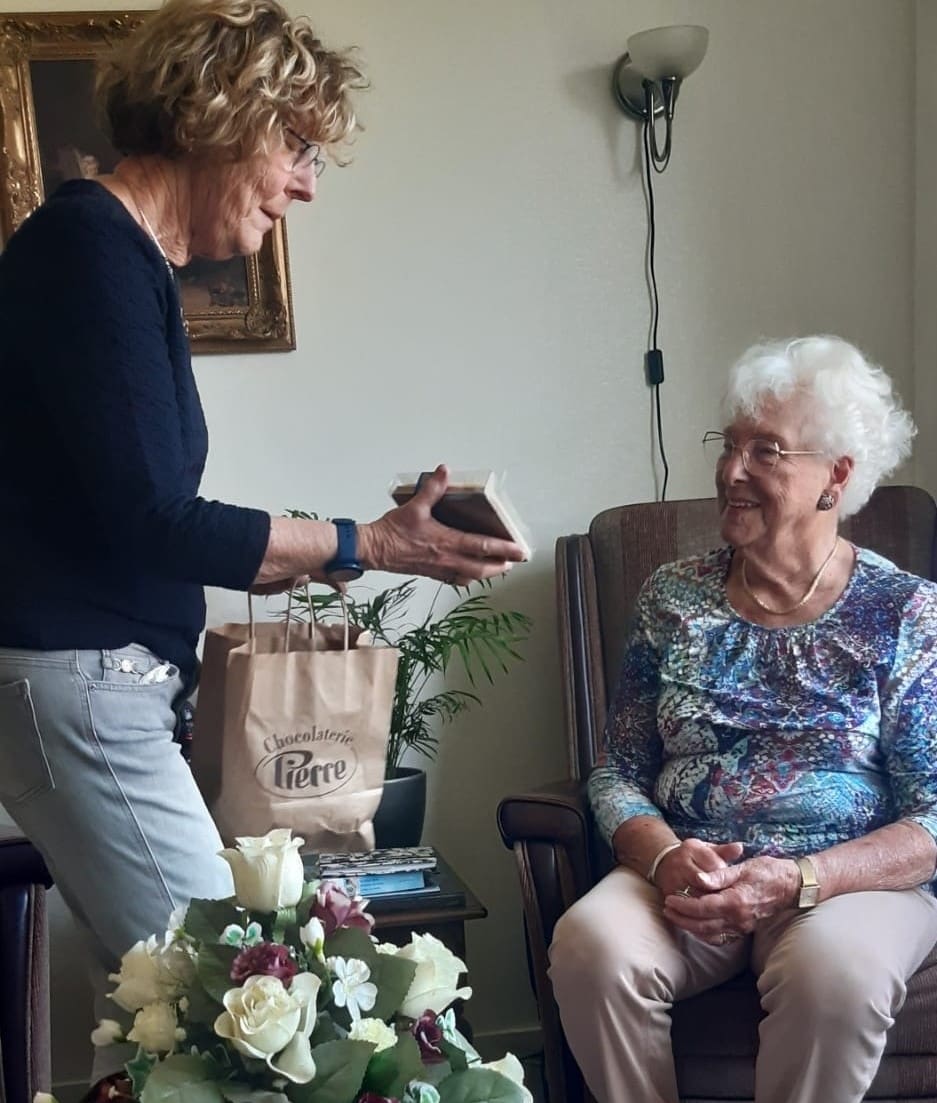 De 500e deelnemer aan Fietsmaatjes Hillegom Lisse, een 90-jarige vrouw uit Lisse, stond sinds augustus vorig jaar op de wachtlijst. Ze kan nu met een fietsmaatje buiten gaan bewegen. Coördinator Harriët verraste haar met chocolade en een tienrittenkaart ter waarde van 30 euro.
