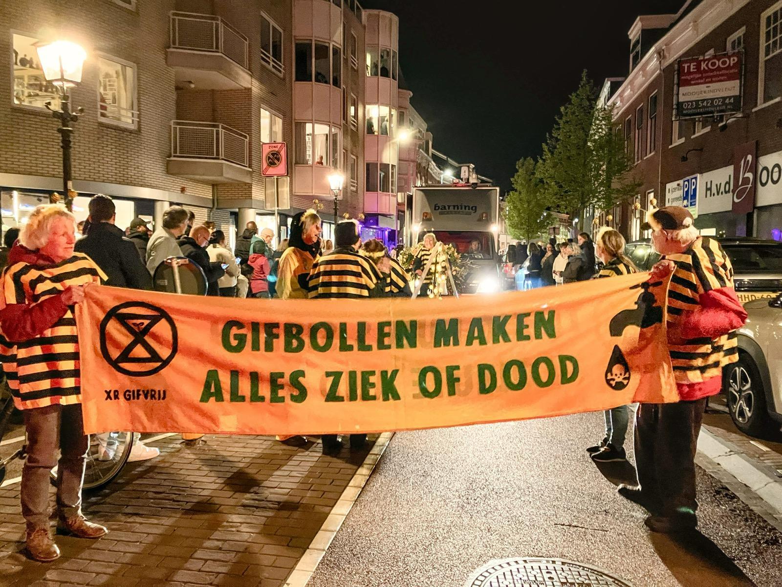 De groepen Extinction Rebellion Gifvrij en Scientist Rebellion zijn zaterdagavond mee gaan lopen in het Bloemencorso, ter hoogte van Haarlem. De groepen droegen banners met teksten als ‘Gifbollen maken alles ziek en dood’. Daarnaast zijn er flyers uitgedeeld aan het publiek. Het is het derde jaar op rij dat ER een soortgelijke actie organiseert.