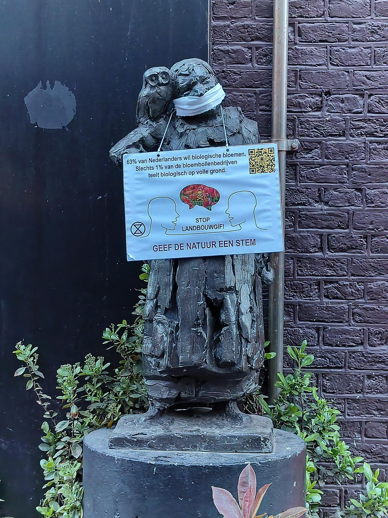 Ook zijn er zondagochtend standbeelden in Haarlem geblinddoekt en is er een bord aan de nek gehangen. Daarop staat dat de meeste mensen biologische bollen willen, maar de sector niet volgt. Volgens de woordvoerder van ER gaat het om ‘statue sunday’, iets wat ER al eerder in Noordwijk en Lisse deed.