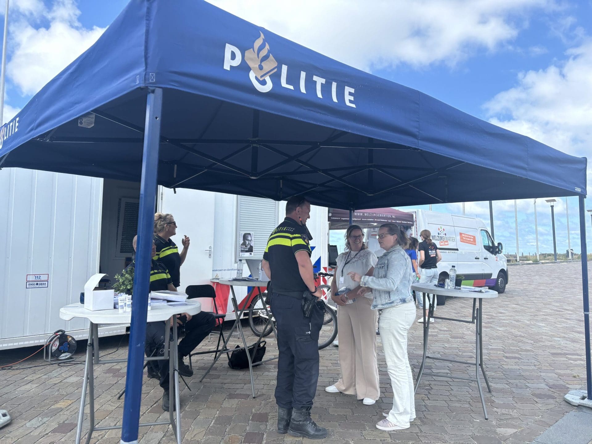 Naast de politietent stond het Welzijnskwartier met een eigen informatiestand. Daar werden informatieve filmpjes vertoond, gericht op jongeren, over thema’s zoals groepsdruk, online gedrag en weerbaarheid. Ook stond er een PlayStation opgesteld, waar jongeren konden spelen en tegelijkertijd in contact komen met jongerenwerkers voor een laagdrempelig gesprek.