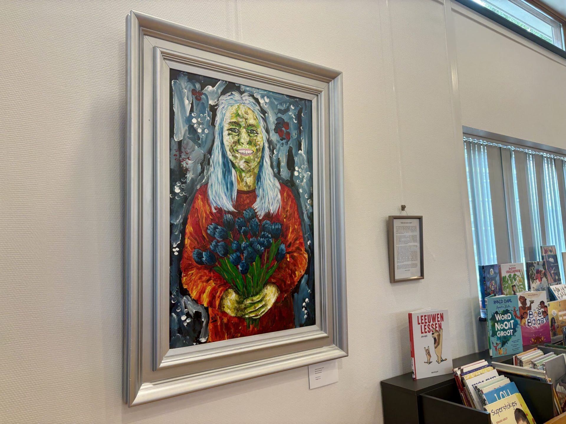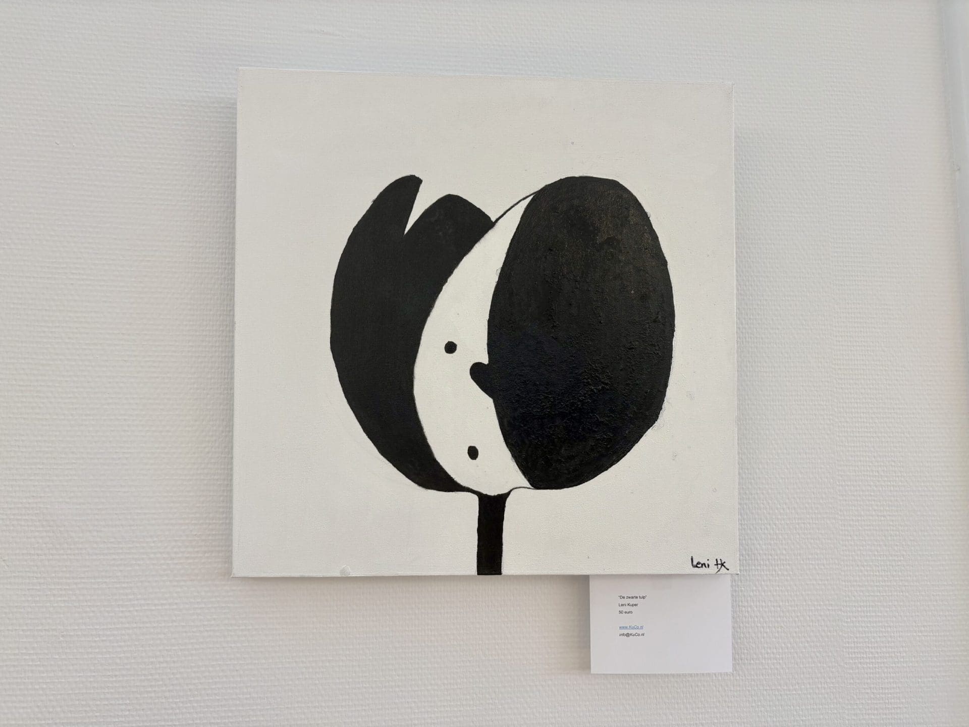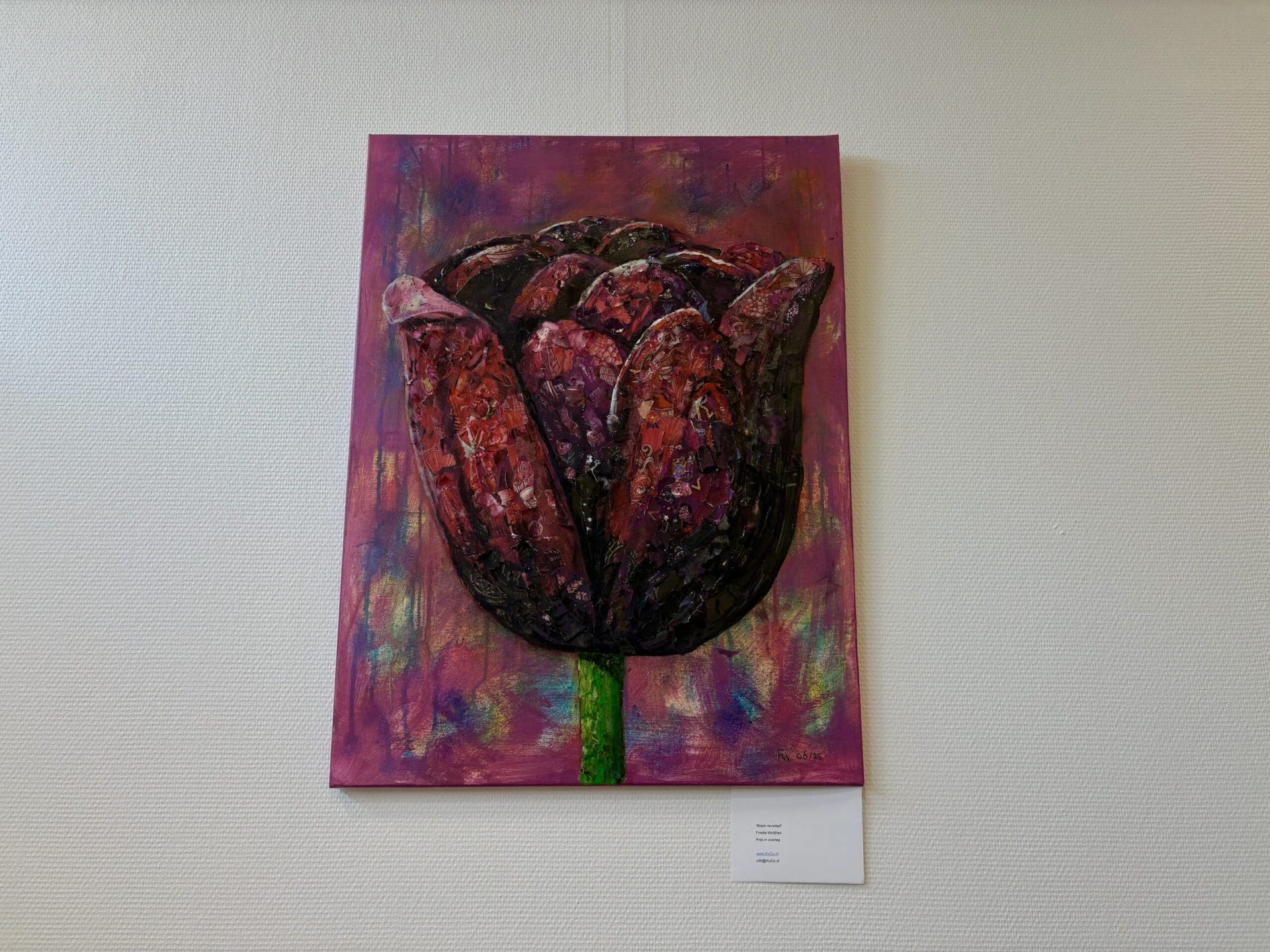 “Ik was wel een beetje bang dat het een heel donkere expositie ging worden”, zegt Alida van Leeuwen, oprichter van KuCo, in de bibliotheek van Lisse. “Maar als je dit nu ziet, zie je dat er enorm veel kleur in en rond de zwarte tulp zit.” Er hangen zo’n dertig werken in allerlei vormen en maten over de tulp door de gehele bibliotheek.