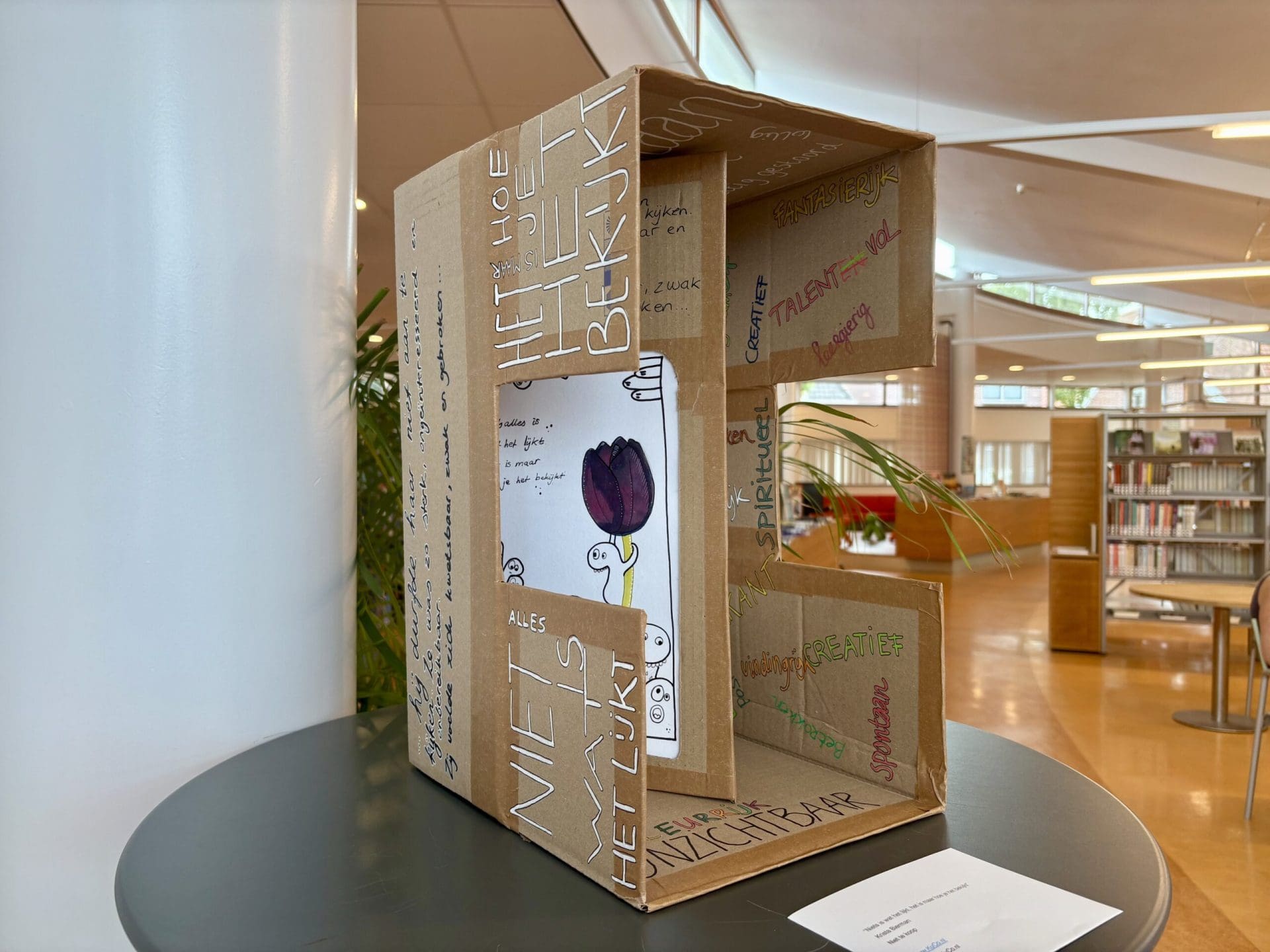 Een jaar geleden las Van Leeuwen over het jubileum van het museum in de krant. “Toen dacht ik: dat is toch best wel bijzonder, daar moeten we iets mee.” Ze stuurde een mailtje naar de leden van het kunstenaarscollectief van kunstenaars uit de hele regio. Een jaar lang werkten ze met z’n allen aan de expositie die nu drie maanden lang te zien is in de bibliotheek.