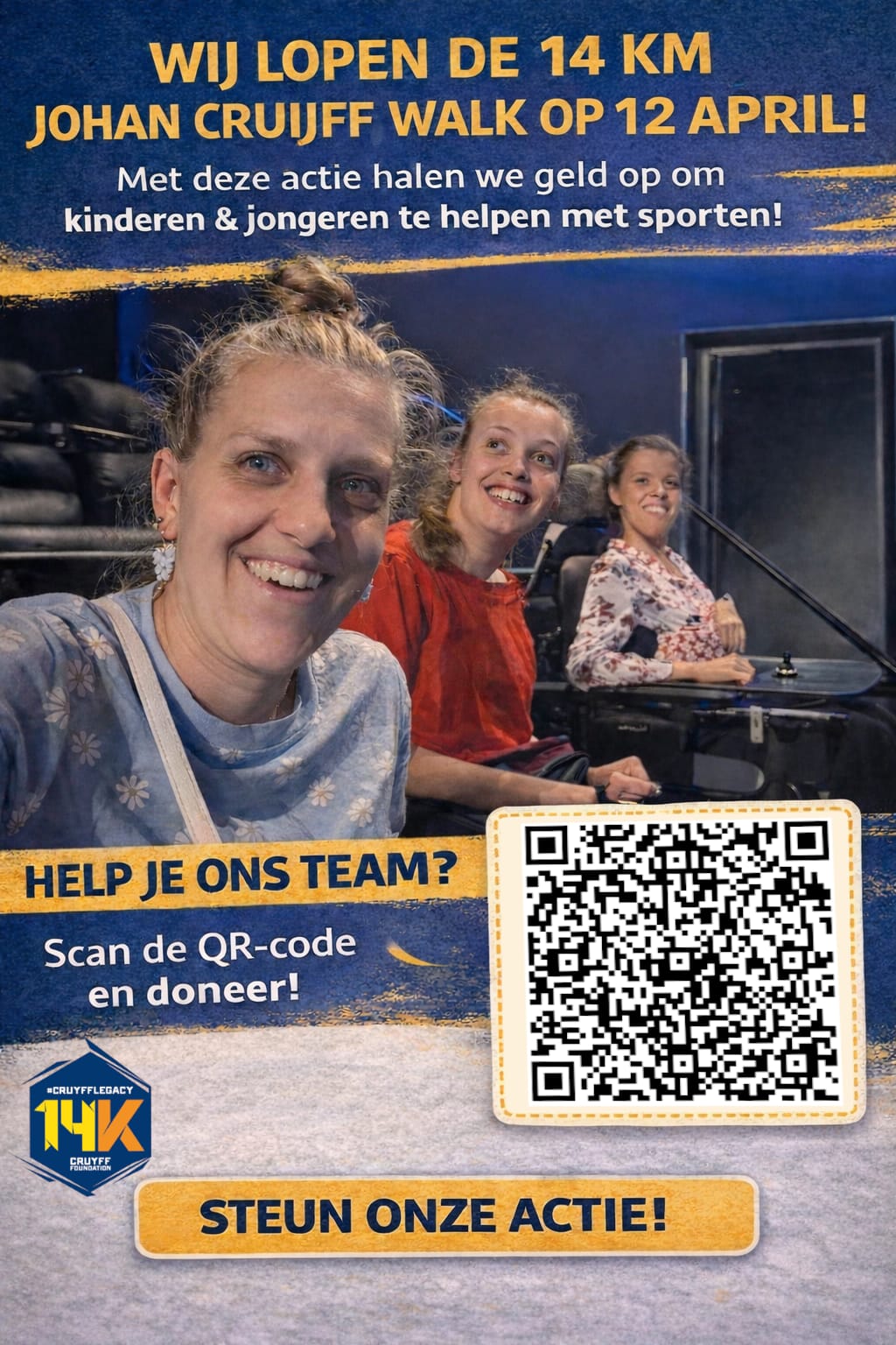 Voorhout – Drie vriendinnen doen op 12 april mee aan de 14K Walk bij de Johan Cruijff ArenA in Amsterdam. Roos, Naomi en Anne lopen 14 kilometer om geld in te zamelen voor de Johan Cruyff Foundation. Deze stichting helpt mensen met een beperking om te sporten.