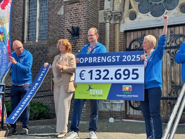 Voorhout – Team Bollenstreek heeft dit jaar 132.695 euro ingezameld voor de Roparun. Dit is het hoogste bedrag dat het team ooit heeft opgebracht. Team Bollenstreek zal komend weekend voor de 19e keer deelnemen aan dit evenement, waarbij teamleden hardlopend 500 kilometer zullen afleggen van Twente naar Rotterdam.