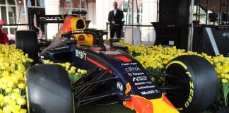 Racewagen Max Verstappen op startlocatie Bloemencorso