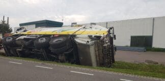 Vuilniswagen kantelt op grens Voorhout-Rijnsburg; verkeer moet omrijden