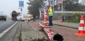 Auto botst op voorganger en rijdt lantaarnpaal uit de grond op...