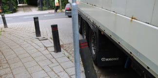 Vrachtwagencombinatie blokkeert Herenweg Warmond en rijdt palen omver