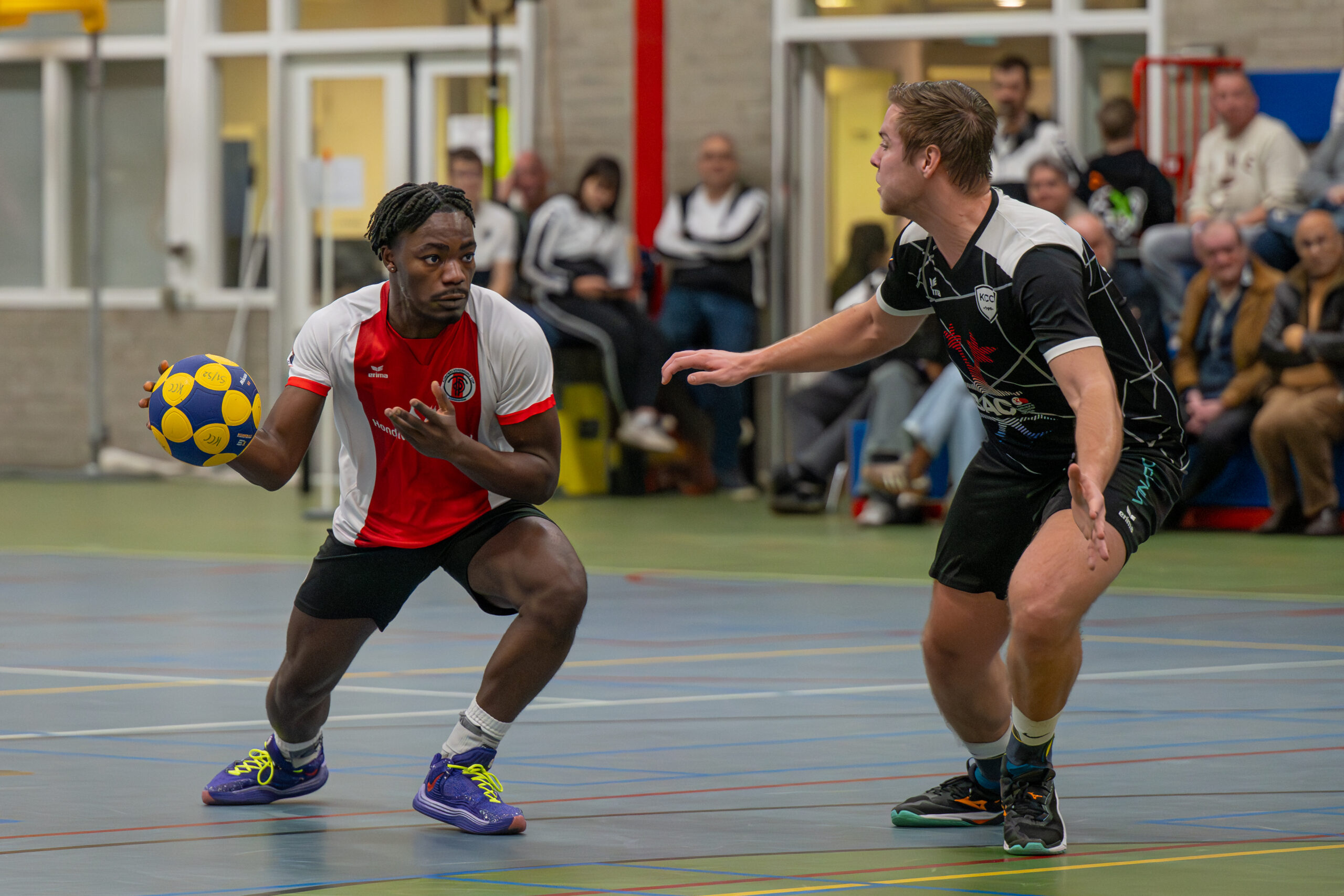 TOP kon zich in de eerste helft in Capelle aan den IJssel maar moeilijk onderscheiden tegen KCC. De thuisploeg ging goed mee in het tempo van de Sassenheimers, die hier en daar ook kansen lieten liggen om een gaatje te slaan. TOP kon constant maar één punt voorkomen, waarna KCC dan weer gelijkmaakte. Hoogtepunten uit het stuivertje wisselen voor de voorsprong waren een doorloopactie van KCC-speler Julian Middelkoop (5-5) en een knappe beweging van Robin Bakker om de 5-6 te maken.