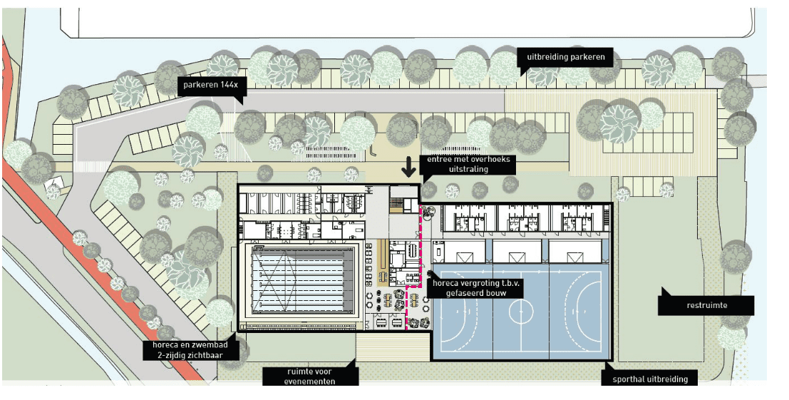 Noordwijkerhout – Bij het ontwerp van een nieuw zwembad op de oude locatie van de Schelft met daarbij tijdelijke woningen, wordt rekening gehouden met de bouw in de toekomst van een sport/cultuurhal. Dat blijkt uit een voortgangsrapportage aan de gemeenteraad. Die ging eerder akkoord met een nieuw zwembad en een onderzoek naar de haalbaarheid van tijdelijke woningen op de restantkavel van de Schelft. Er is nu een ontwerp waarbij het zwembad op een prominente plek ligt en waarbij het horecagedeelte aan de achterzijde is geplaatst. Als er later besloten wordt dat er nog een hal bij komt kan deze naadloos aan het horecadeel worden gebouwd.