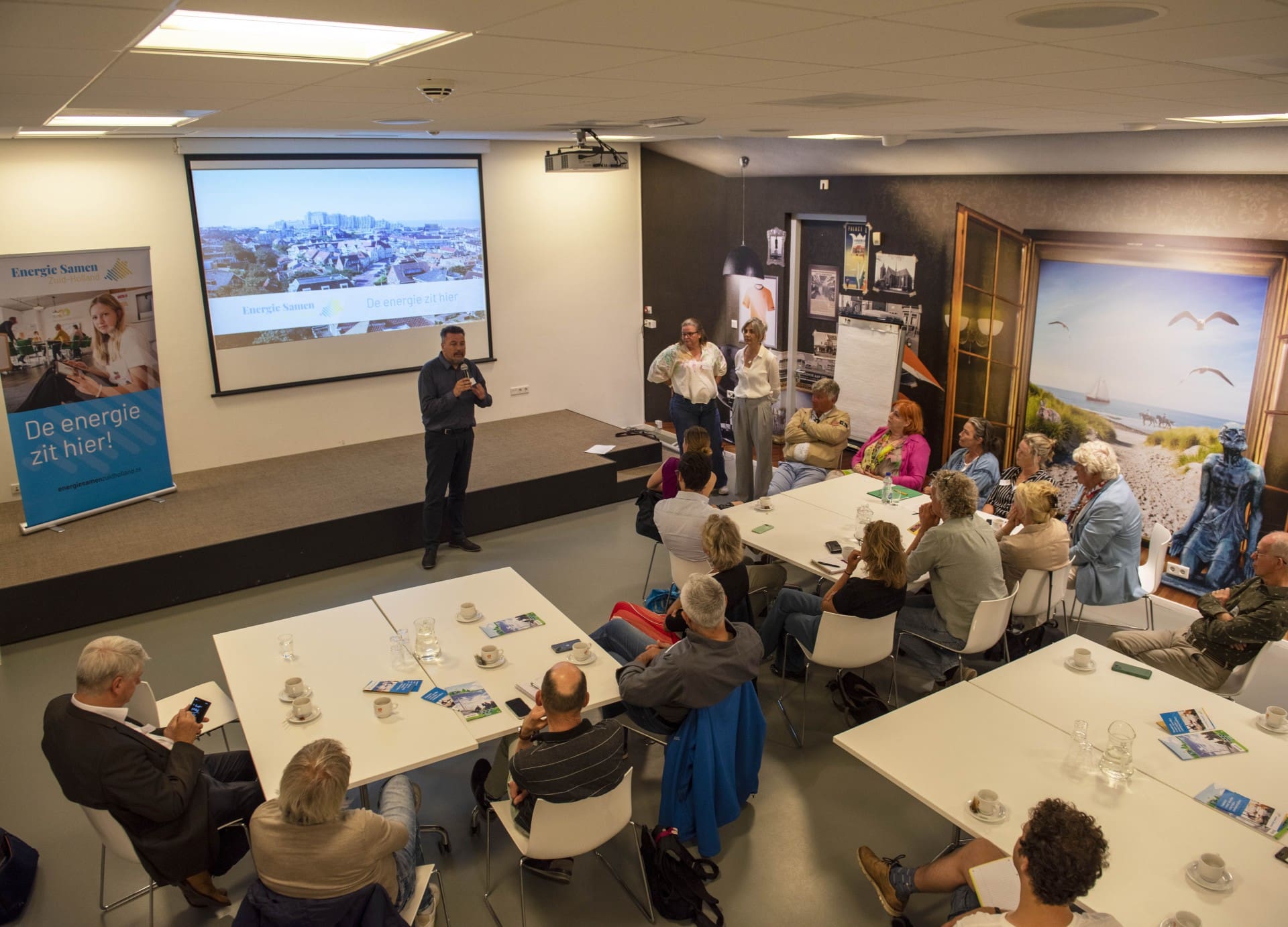 Een voorbeeld hiervan is De Muze. Theaterdirecteur RO Krauss vertelde over de contacten die hij heeft met zijn buren, zoals Groot Hoogwaak en de KNRM, om samen zonne-energie te gaan opwekken en delen. In groepjes spraken de aanwezigen over duurzaamheid, energietransitie en kostenbesparing. Ook energiearmoede kwam ter sprake. Energiegemeenschappen zouden mensen kunnen helpen die moeite hebben met het betalen van de nota, bijvoorbeeld door teveel opgewekte energie lokaal te leveren aan mensen of instellingen die dat goed kunnen gebruiken.