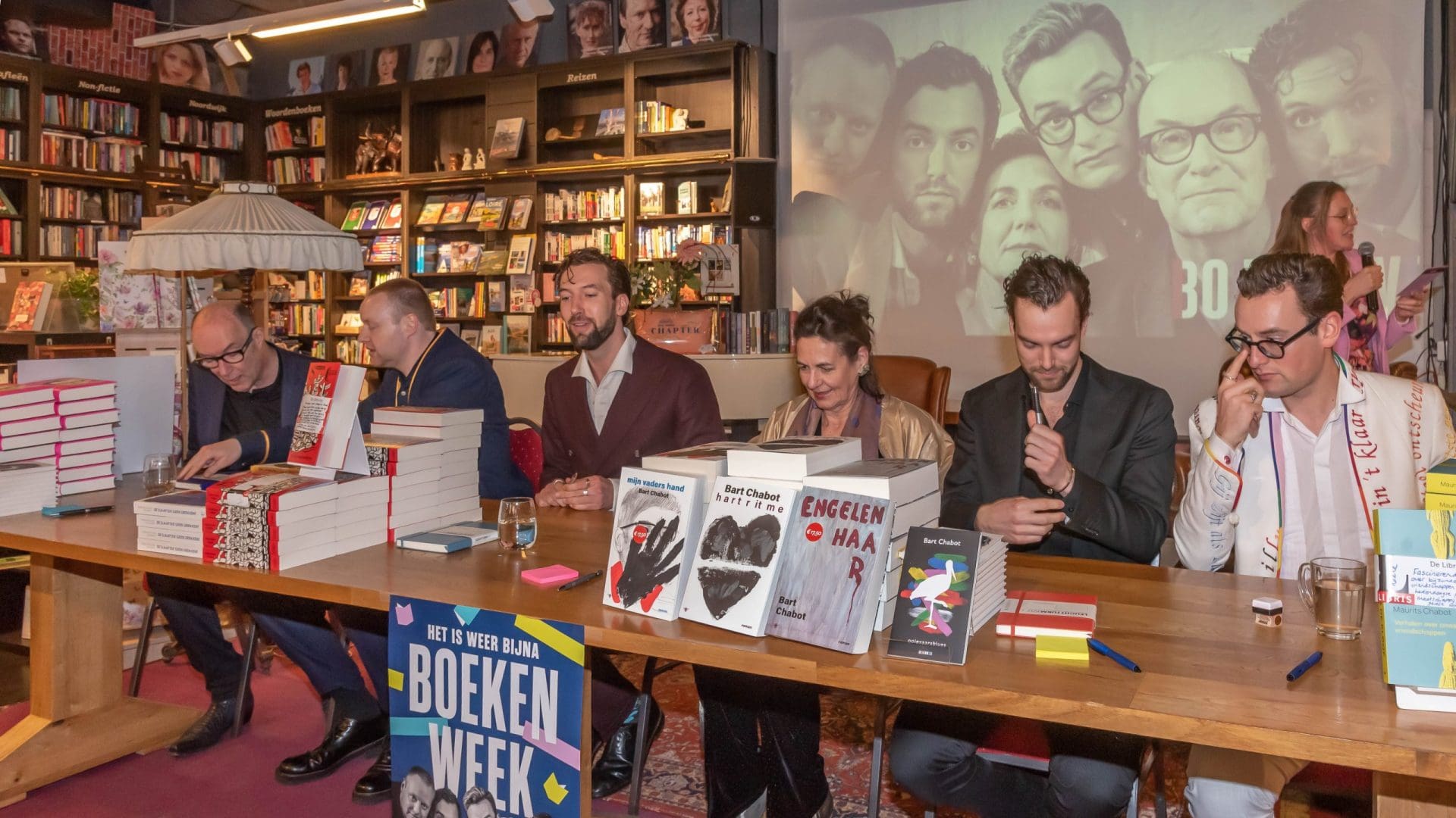 Noordwijk – De schrijvers van het boekenweekgeschenk van dit jaar waren in het cultuurcafé om hun boek te presenteren. Normaal is er één schrijver, maar nu een hele tafel vol. Het boekenweekgeschenk is namelijk van de familie Chabot en heeft als titel: Gezinsverpakking. Onder grote belangstelling werd er gesigneerd.