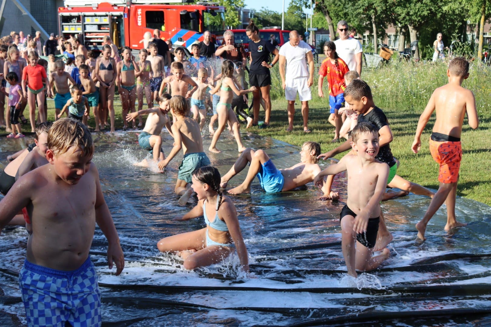 Toen duidelijk werd dat het een warme avond zou worden, werden de koppen bij elkaar gestoken en volgde een bericht op sociale media. Met resultaat: honderden kinderen en ouders kwamen naar de Wilhelminalaan, waar de brandweer voor het gemeentehuis een waterpark maakte.