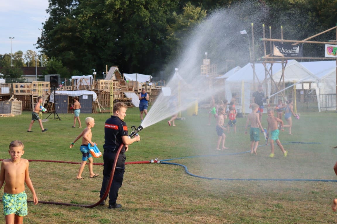 Op de warmste dag van de week hadden de kinderen zich flink in het zweet getimmerd. Een verkoeling door de brandweer was dus zeer welkom. De slangen werden door de brandweer uitgerold en de kinderen verruilden moeiteloos de hamers voor waterpistolen.