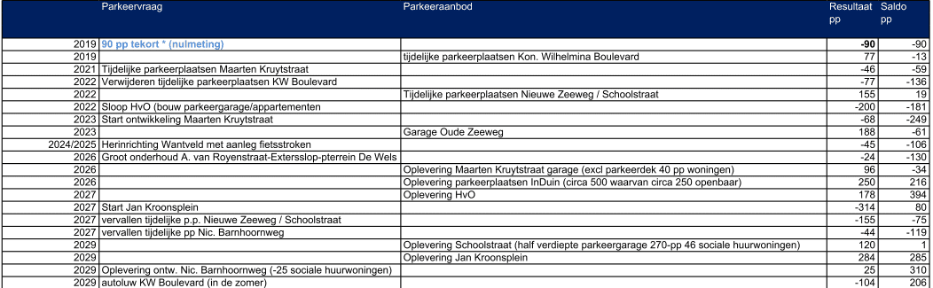 Met parkeerplaatsen die er de komende vier jaar afgaan en elders weer bijkomen, moet het tekort in 2029 zijn opgelost. Het college van B & W waarschuwt dat de parkeerbalans een dynamisch document is, gebaseerd op de huidige situatie. Er kunnen dus nog veranderingen optreden.