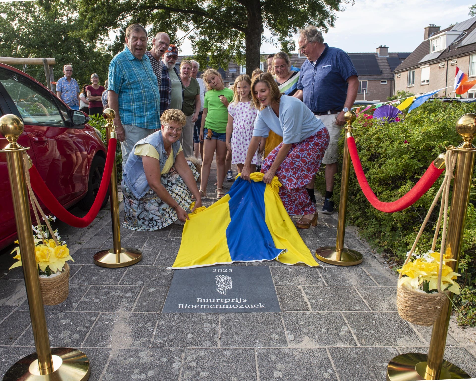 Lisse – Wethouder Jolanda Langeveld heeft woensdagavond bij de speeltuin aan de Waterman in Lisse de Buurtprijs onthuld. Ze werd daarbij geholpen door betrokken buurtbewoners en Dorien Ruigrok van het bestuur van Bloemen Mozaïek Lisse.