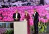 Bloemencorso deelt tulpen uit, met hulp van zanger