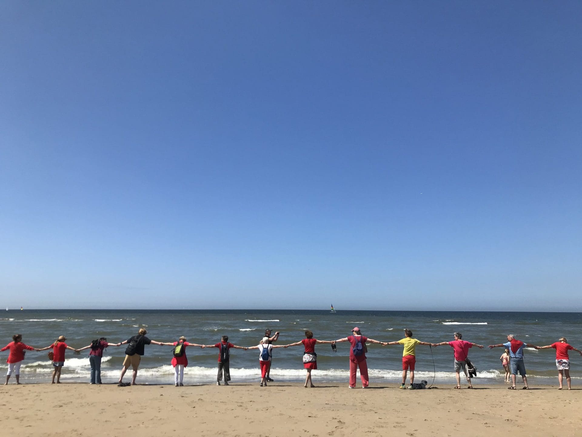 Noordwijk – Terwijl de Noordwijkse strandgangers op zondagmiddag genieten van de zon, vormt zich rond de klok van twee vlak voor de kustlijn een door mensen gecreëerde klimaatketting. De Climate Chain is een initiatief van duurzaamheidsorganisatie Urgenda. Langs de hele Nederlandse kust komen de in het rood geklede deelnemers samen om zich, op een sympathieke manier, uit te spreken voor meer klimaatmaatregelen vanuit Den Haag.