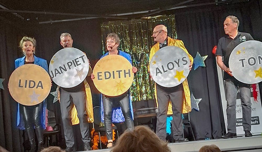 Jan-Piet Does, Aloys Standaert, Edith Wolvers, Lida van de Wilden en technicus Ton Wolvers zetten een humorvolle show neer.