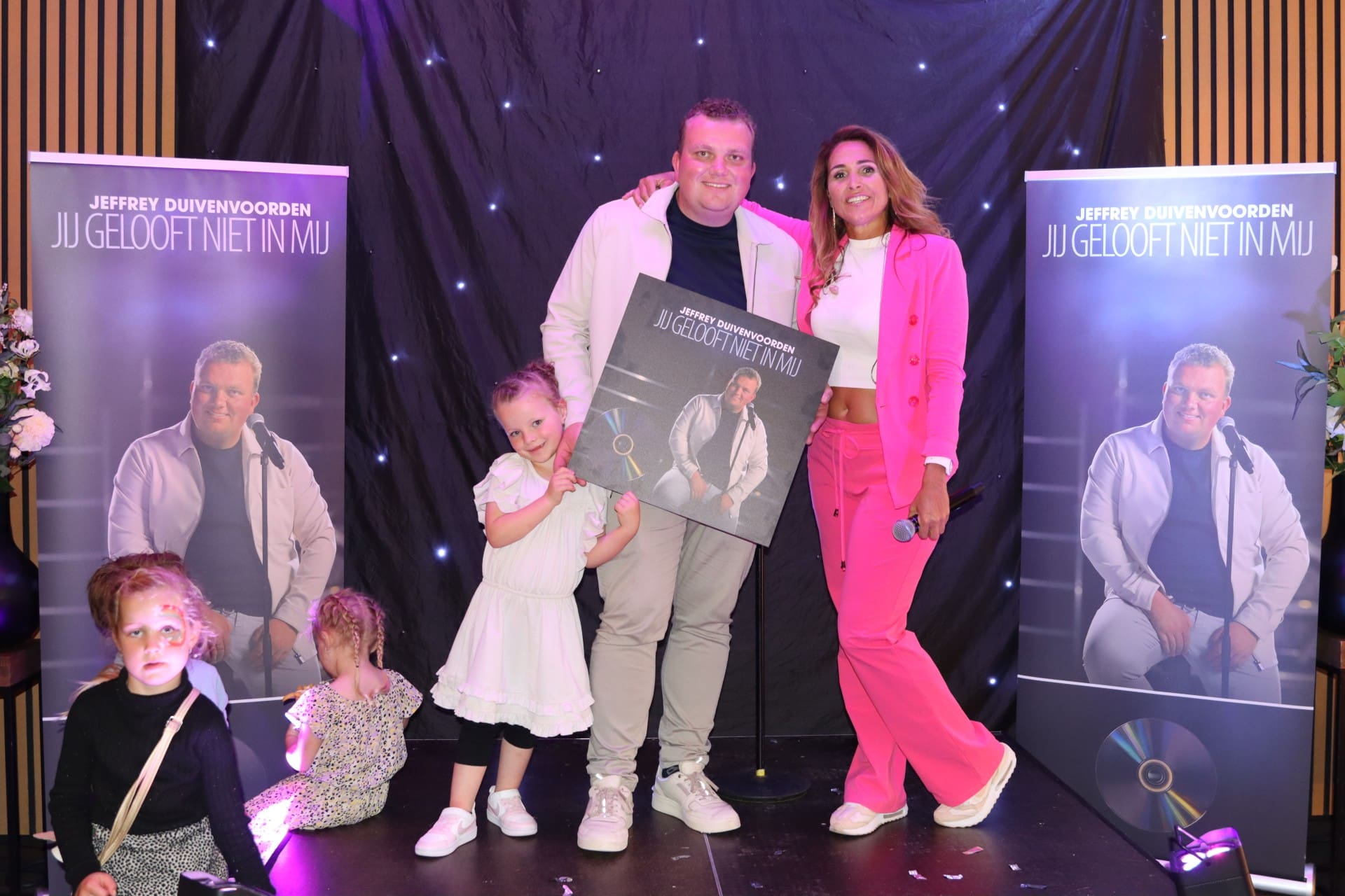 Noordwijkerhout – Zanger Jeffrey Duivenvoorden (25) uit Noordwijkerhout heeft zondag zijn debuutsingle “Jij gelooft niet in mij” gepresenteerd. Tijdens een feest in Hillegom werd de single uitgereikt door zijn zangcoach Ruby van Urk en zijn nichtje Bo (5), met wie hij een hechte band heeft.
