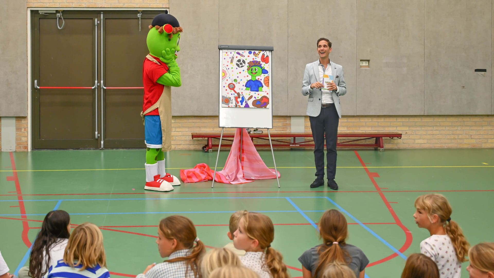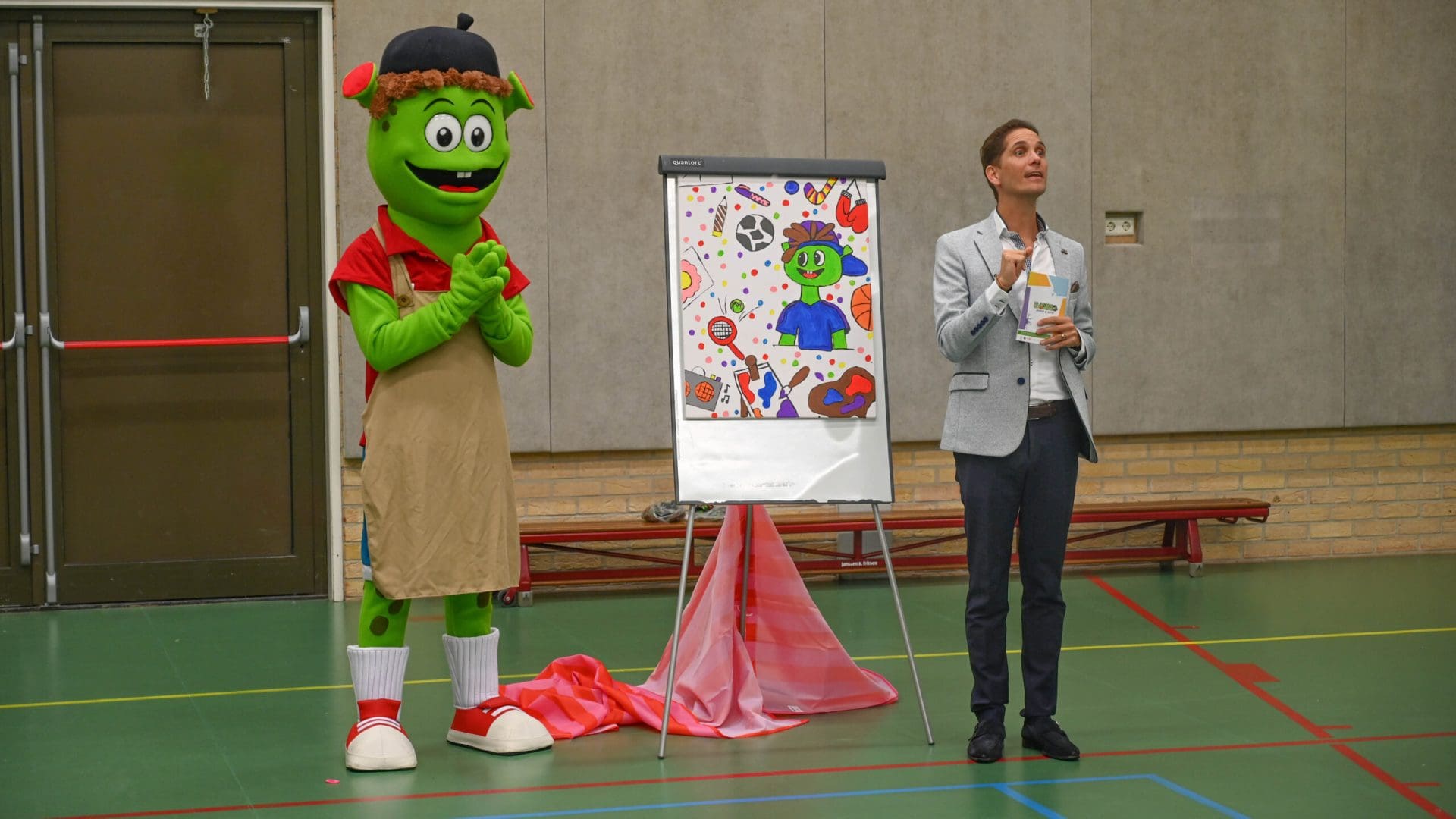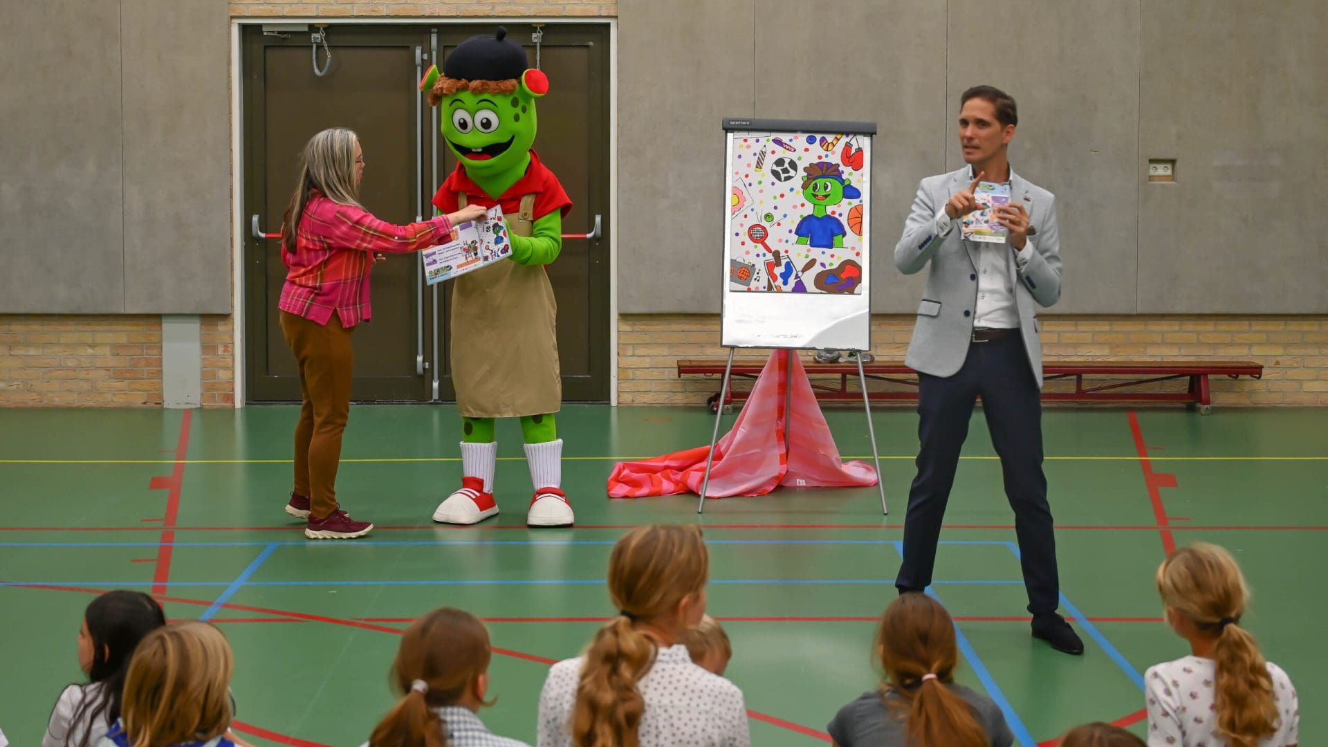 Noordwijkerhout – De tekening van Demi uit groep 8 van basisschool De Regenboog in Noordwijkerhout komt op de voorkant van het nieuwe Sjors Sportief & Creatief-boekje. Demi heeft donderdag het eerste exemplaar van dit boekje gekregen van wethouder Roberto ter Hark en Sjors Sportief zelf. Als prijs mag Demi samen met haar klasgenoten genieten van een middagje zwemmen.