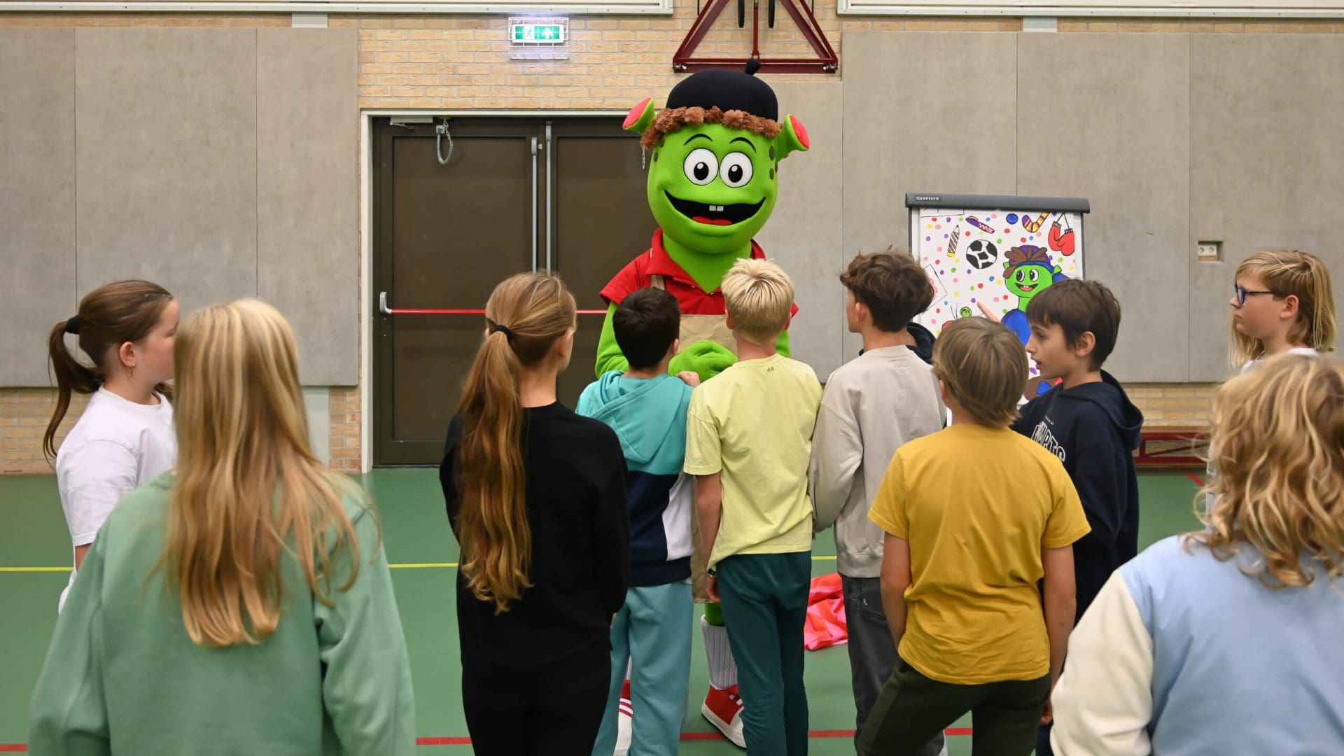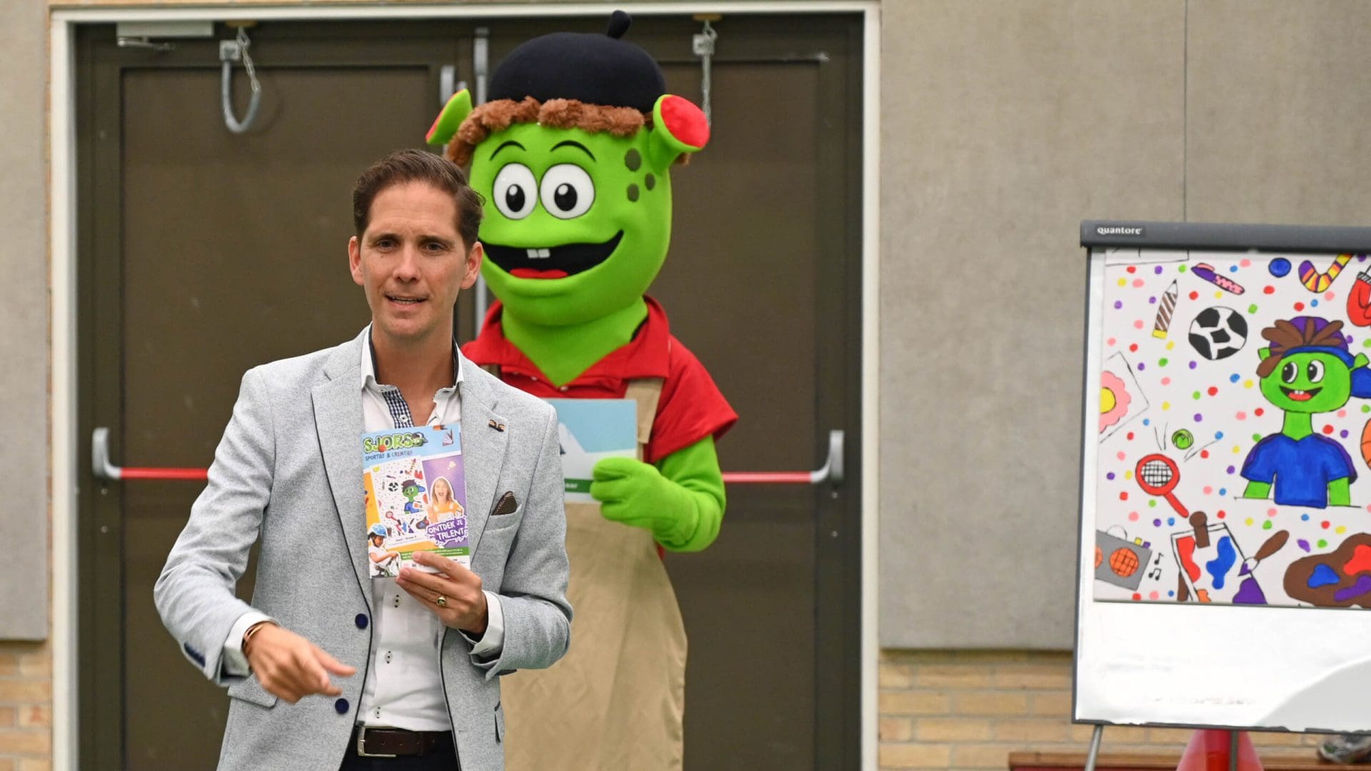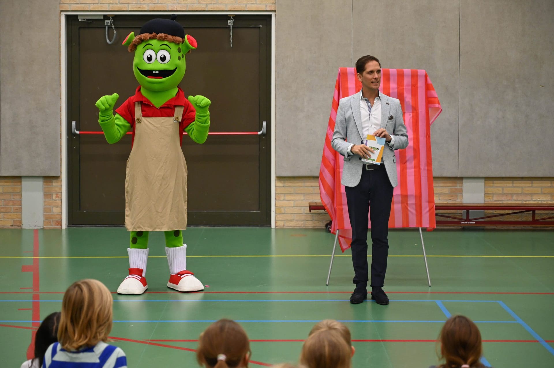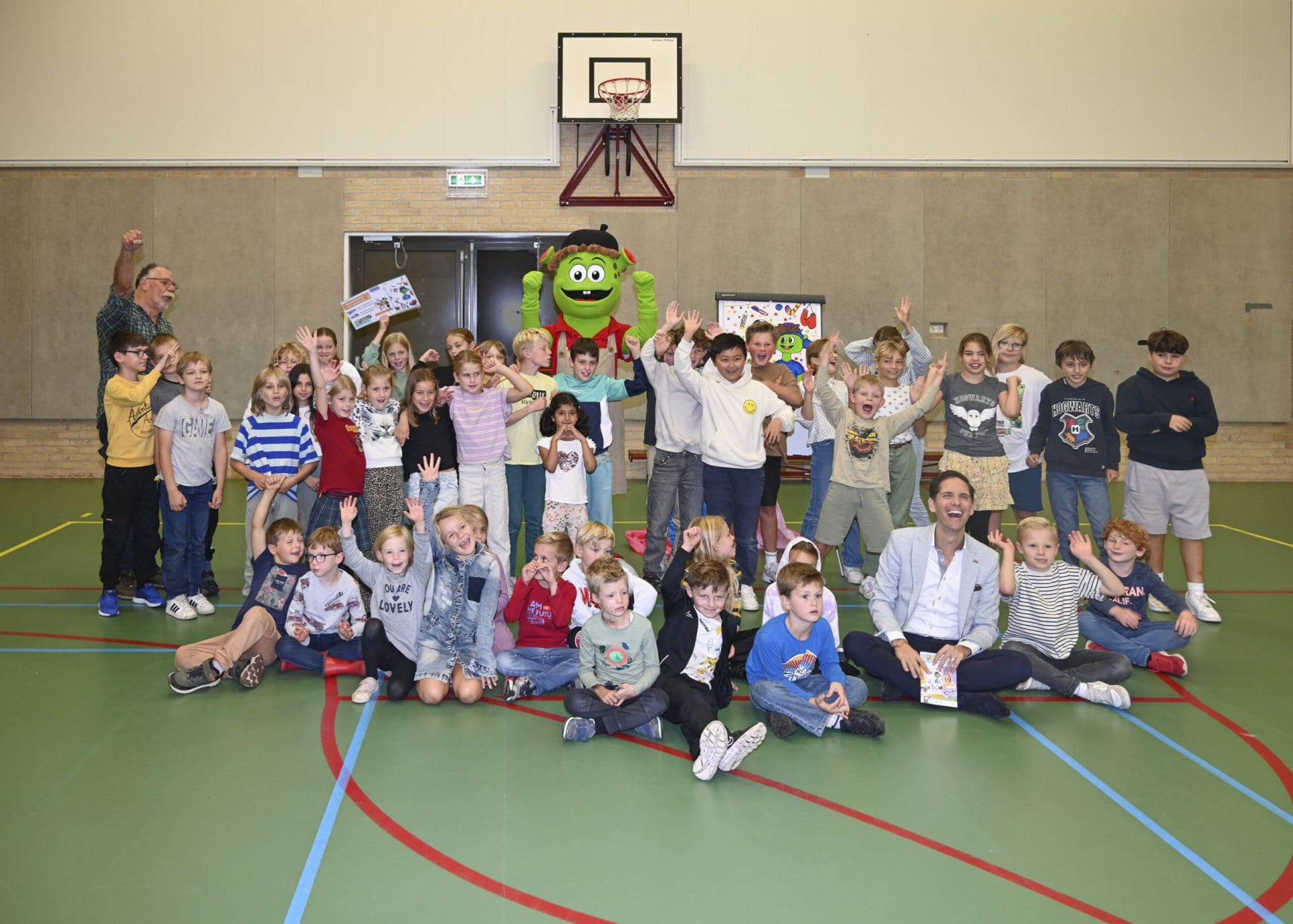 Noordwijkerhout – De tekening van Demi uit groep 8 van basisschool De Regenboog in Noordwijkerhout komt op de voorkant van het nieuwe Sjors Sportief & Creatief-boekje. Demi heeft donderdag het eerste exemplaar van dit boekje gekregen van wethouder Roberto ter Hark en Sjors Sportief zelf. Als prijs mag Demi samen met haar klasgenoten genieten van een middagje zwemmen.
