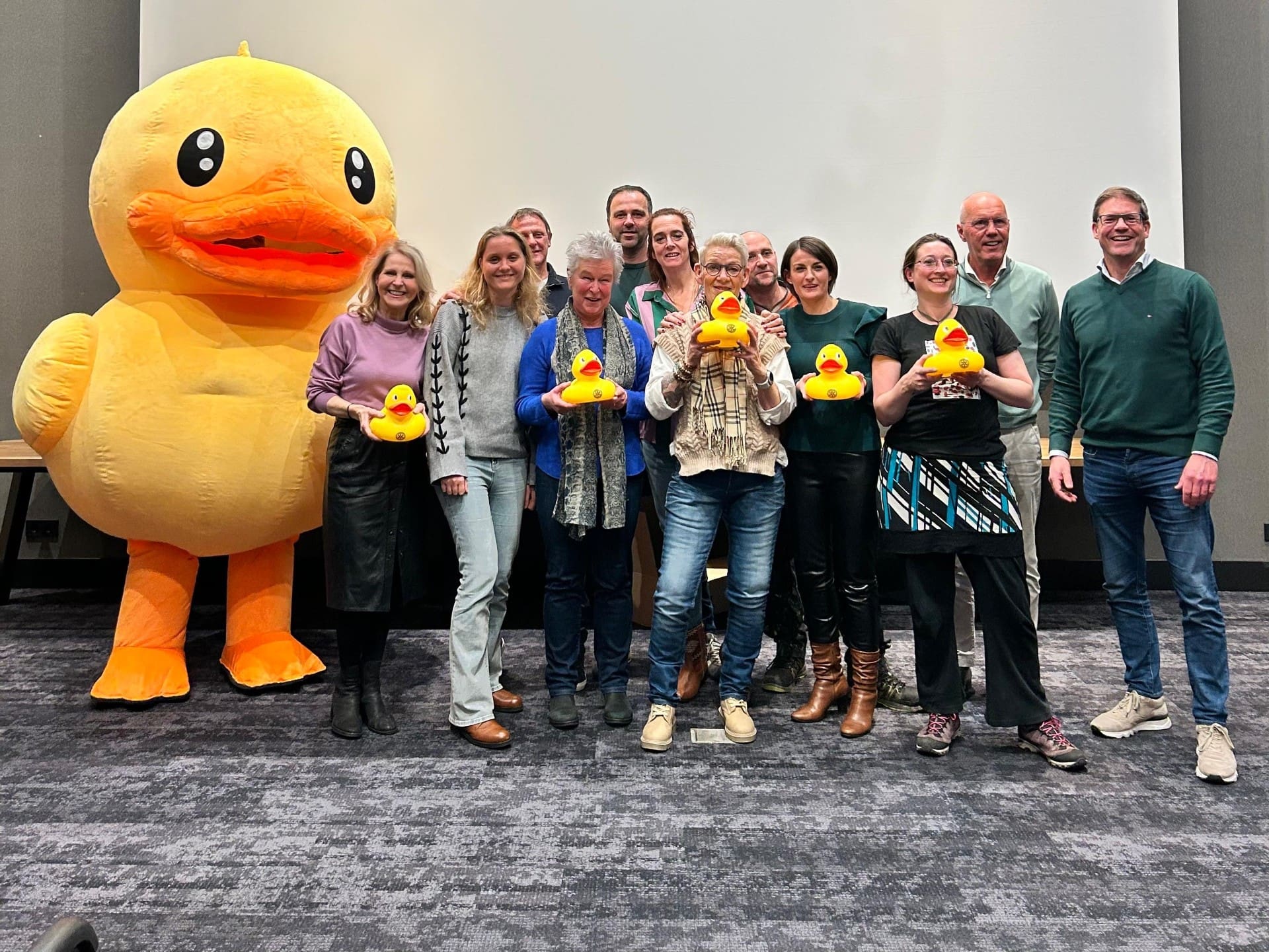 Als afsluiting poseerden alle betrokkenen samen met Duckie, de vrolijke mascotte van de eendjesrace, voor een groepsfoto.