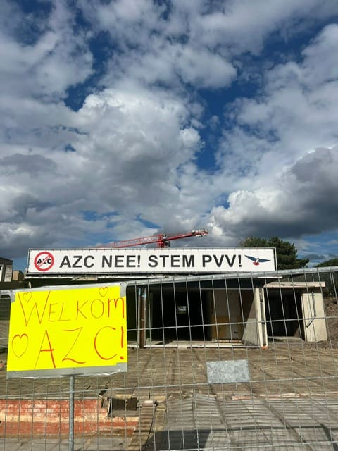 Aan de Grent ging een spandoekmaker een stap verder. Op een slooppand werd een spandoek met de tekst: ‘AZC nee Stem PVV’ opgehangen. Daar is nu een spandoek bij gekomen met de tekst: Welkom AZC! aangevuld met drie hartjes. En zo is op één plek in Noordwijk de discussie in balans.
