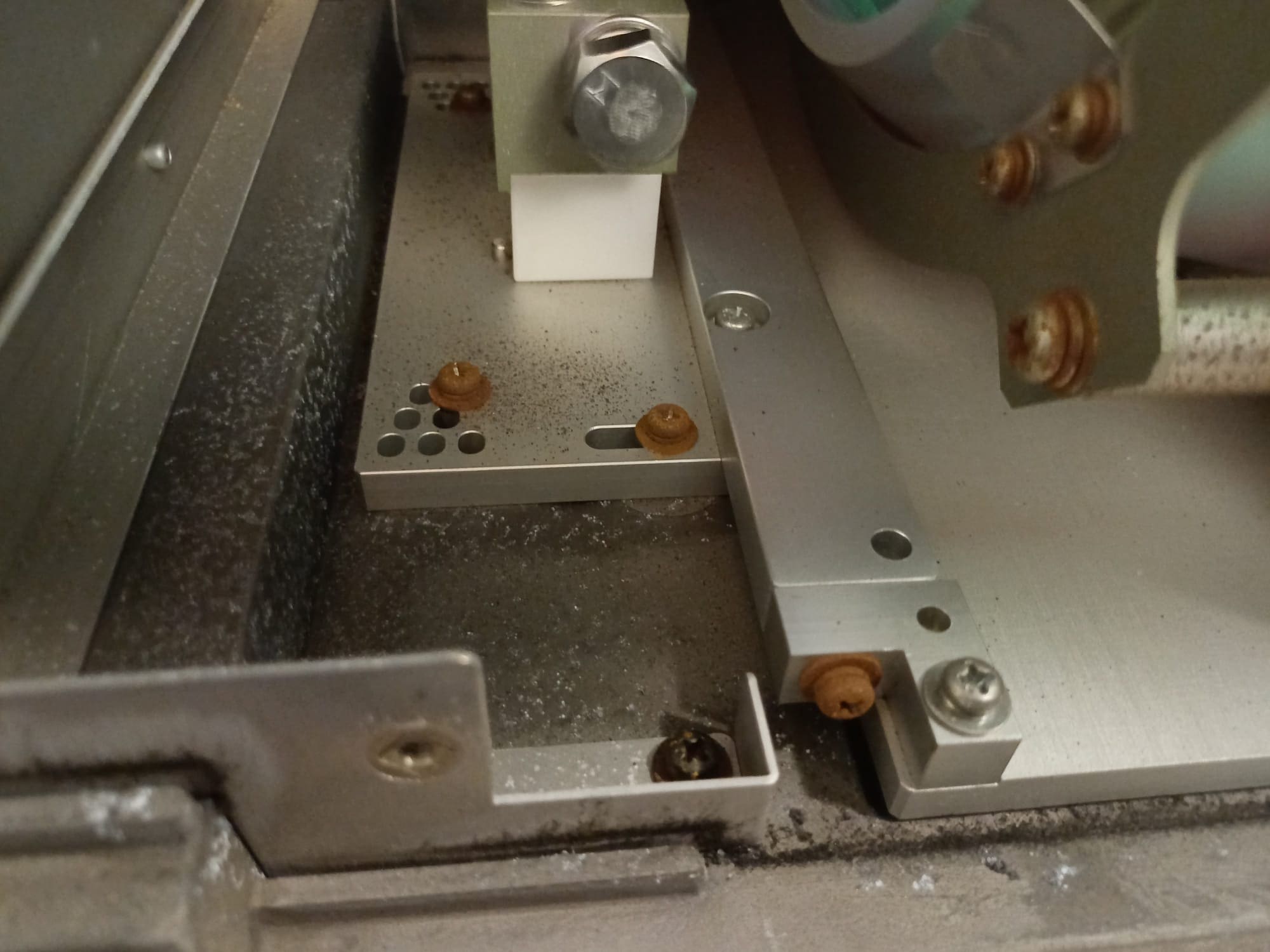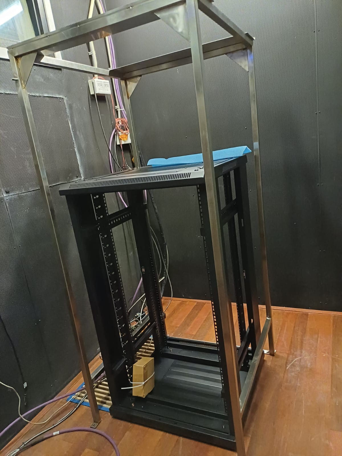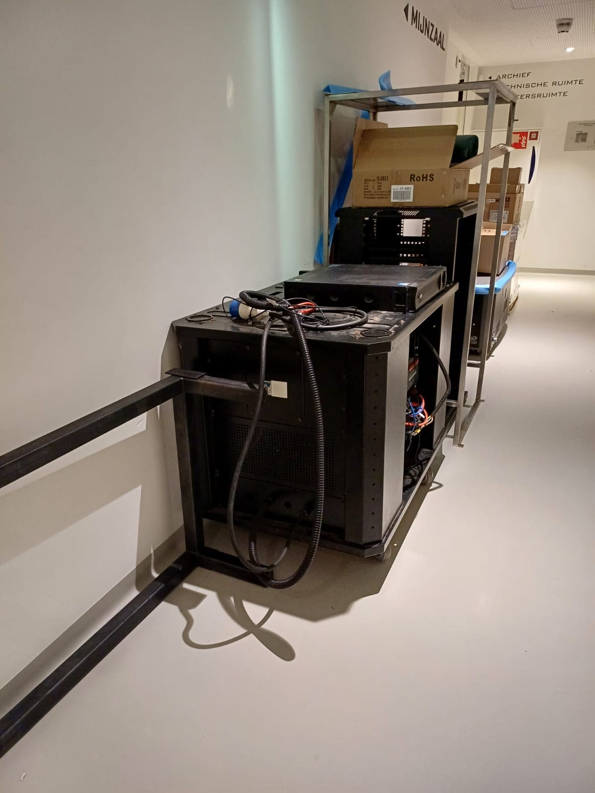 Het timmerwerk en de luchtafzuiging is al uitgevoerd en ook de luchtafzuiging is verzorgd. De hoge luchtvochtigheid in de ruimte heeft echter ernstige corrosie veroorzaakt op de projectorlamp en stalen bouten, wat zorgwekkend is voor het behoud van de nieuwe apparatuur. Een op hand gemaakte nieuwe projectortafel is ontworpen en gemaakt, en onder de tafel is een serverkast geplaatst voor de geluidsprocessor en overige apparatuur.