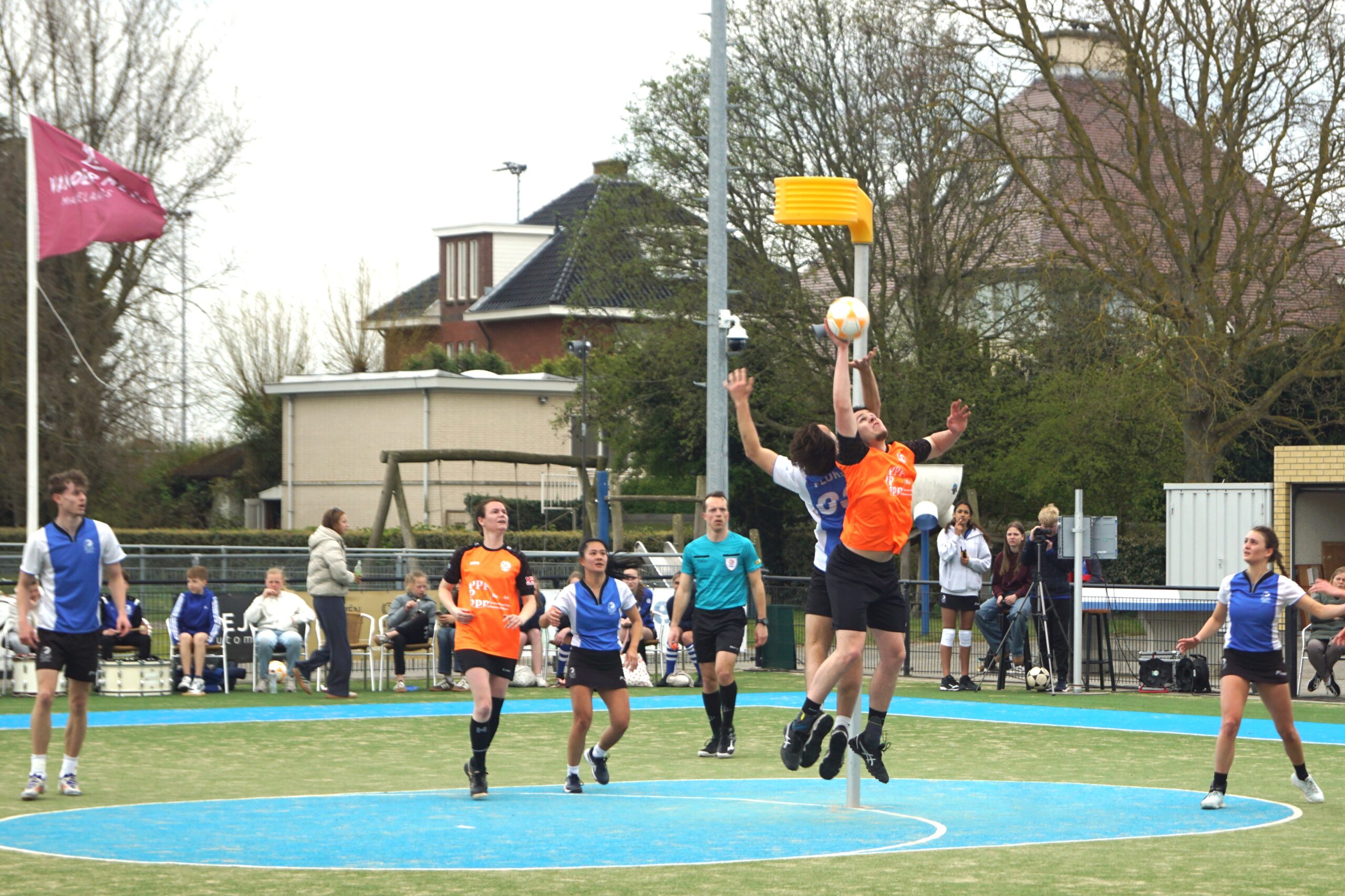 De Noordwijkers begonnen sterk aan de wedstrijd, al lukte het niet om uit te lopen. Mede door de harde wind hadden beide teams moeite met het vinden van de korf, waardoor er maar weinig gescoord werd in de eerste helft. Het was stuivertje wisselen voor de voorsprong maar uiteindelijk ging Fluks aan de leiding voor de pauze: 6-4.