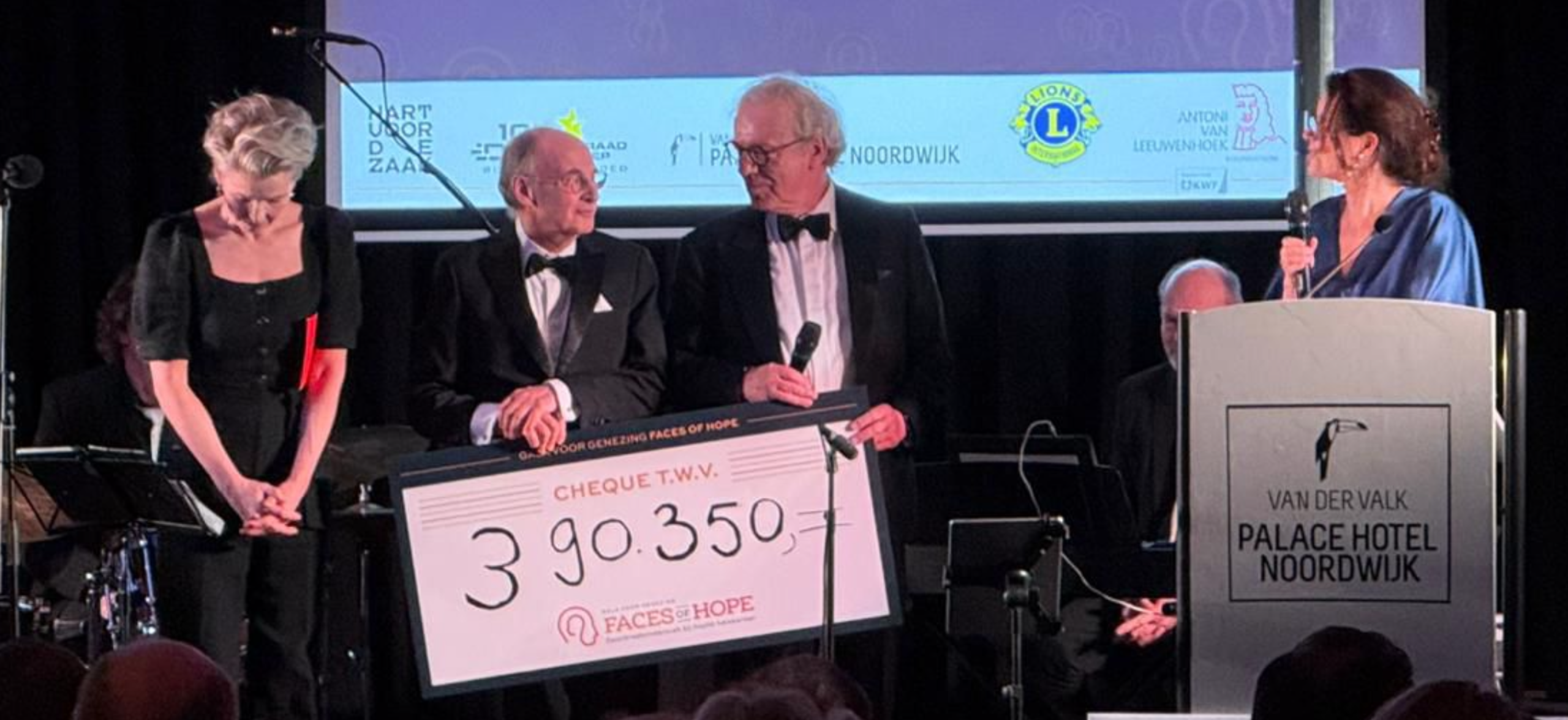 Noordwijk – Het gala ‘Faces of Hope’ in het Palace Hotel in Noordwijk heeft vrijdagavond 390.350 euro opgehaald voor onderzoek naar immuuntherapie om kanker te bestrijden. Het gala was een initiatief van de Lionsclub uit Huizen en de Noordwijkse Paul Brandjes. Het geld moet specifiek gebruikt worden voor onderzoek naar de bestrijding van hoofd- en halskanker.