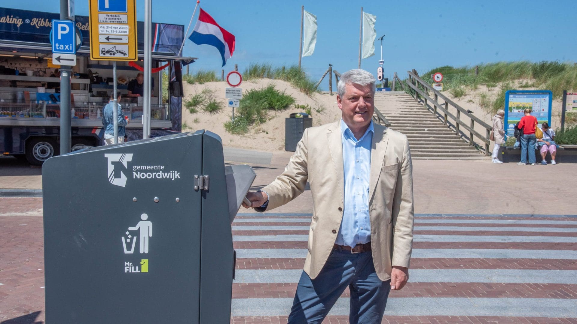 Noordwijk – Wethouder Theo Alkemade heeft maandagmiddag bij het Gat van Palace een slimme prullenbak in gebruik gesteld. De bak werkt op zonne-energie en kan dankzij een persmechanisme veel meer afval aan dan de oude prullenbakken. Bovendien is de slimme bak goed afsluitbaar, waardoor er minder stankoverlast is en ongedierte minder kans krijgt om het afval aan te vreten. Noordwijk plaatst de slimme prullenbakken de komende weken op plekken waar veel mensen rondlopen en dus relatief veel afval wordt weggegooid.