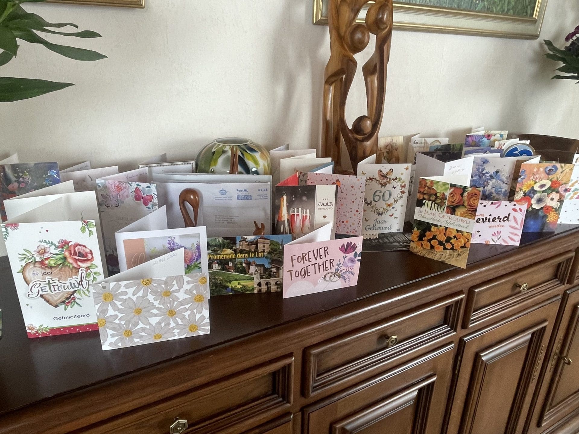 Het bruidspaar is omgeven door bloemen en tientallen kaarten van vrienden en familie. Het geheim van zo’n vrolijk en nog steeds verliefd stel: ”Allebei plezier hebben in de ander een plezier doen.”