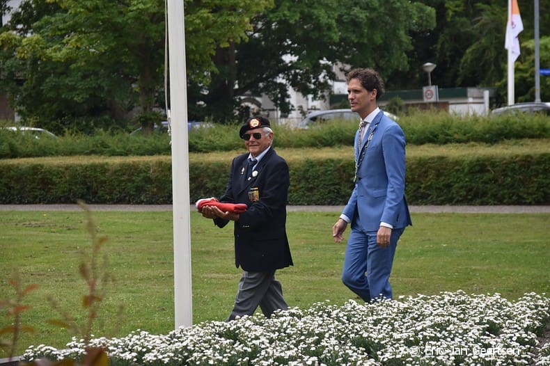 Vervolgens is er een bloemstuk bij het monument neergelegd door de burgemeester. Dat deed hij niet alleen, maar samen met de zoon van de oudste veteraan uit Hillegom. De veteraan overleed zondag op 97-jarige leeftijd. Ter nagedachtenis aan hem werd het bloemstuk gelegd.