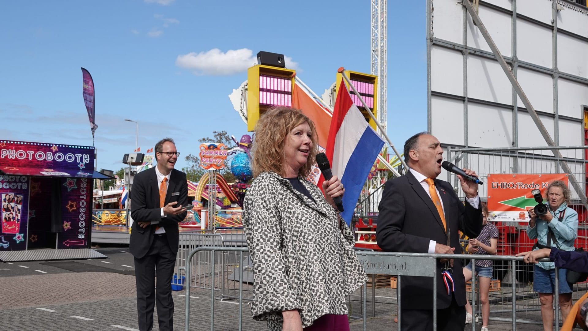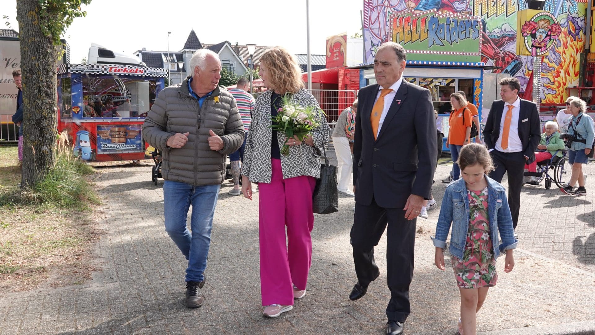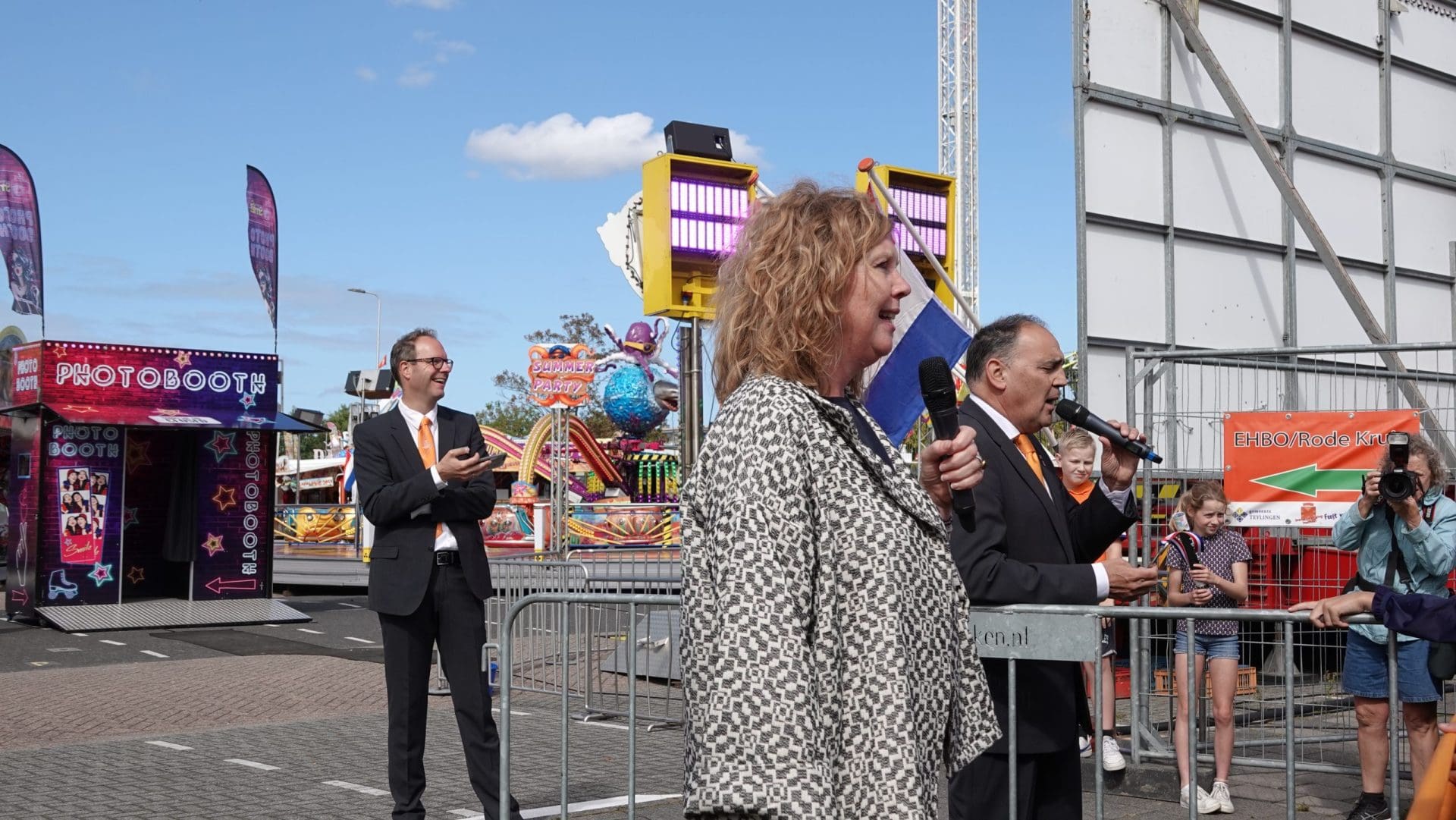 Voorhout – De kermis is woensdagmiddag geopend. Oud-voorzitter Ton van Wolven en wethouder Elsbeth Koek knipten ceremonieel een oranje lint door met een groot publiek kinderen erbij.