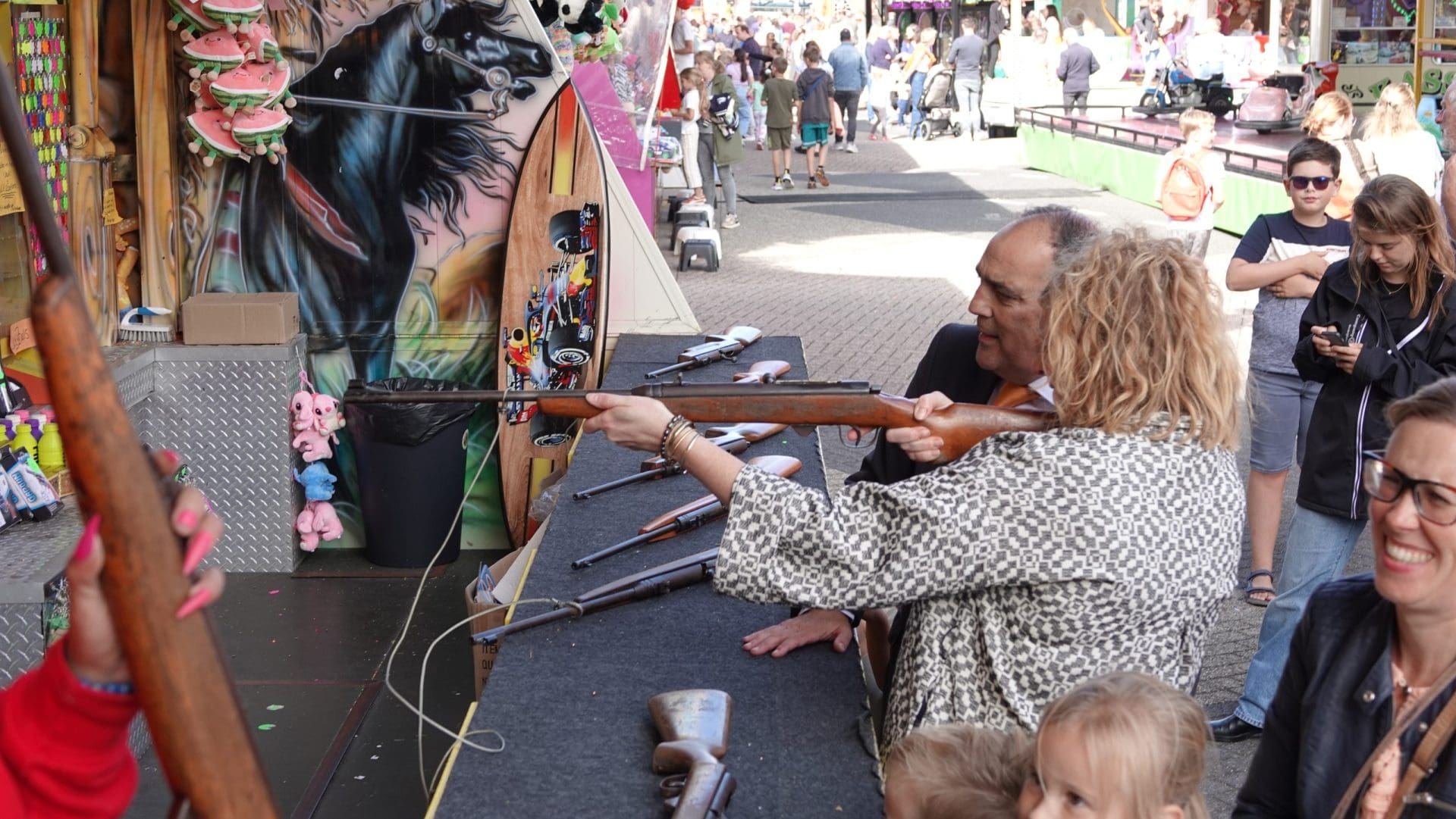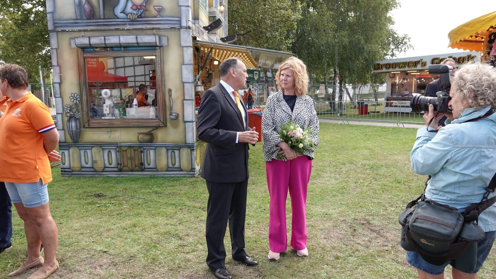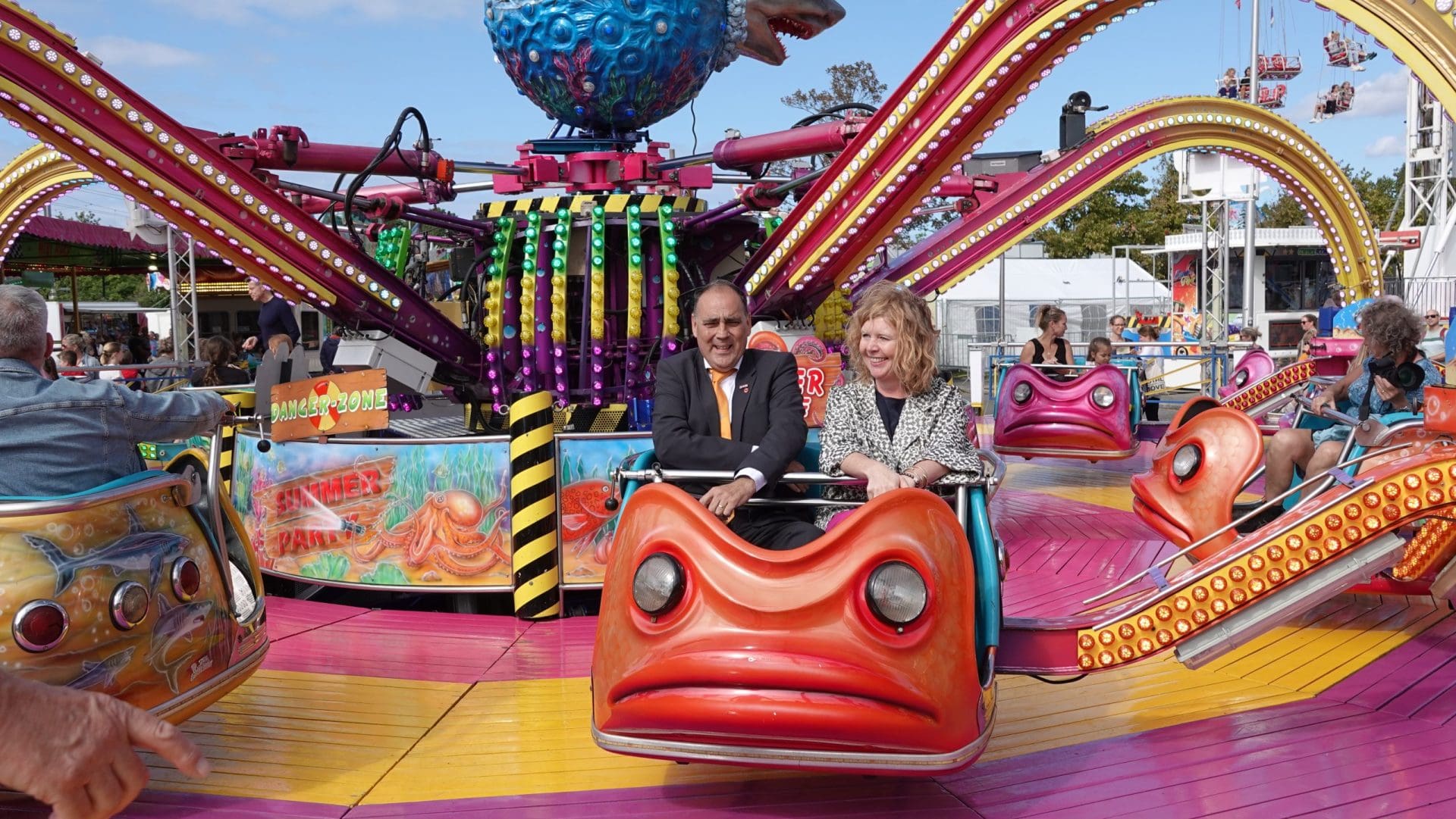 Voorhout – De kermis is woensdagmiddag geopend. Oud-voorzitter Ton van Wolven en wethouder Elsbeth Koek knipten ceremonieel een oranje lint door met een groot publiek kinderen erbij.