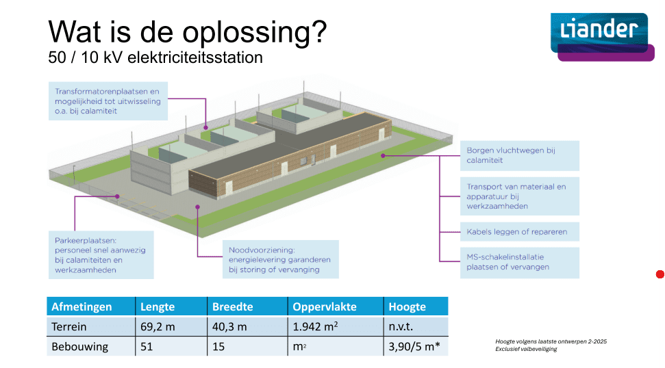 De oplossing is volgens Liander een nieuw elektriciteitsstation van 51 meter lang en 15 meter breed (zie afbeelding), waar een terrein van 69 meter lang en 40 meter breed voor nodig is. Over de afmeting van het nieuwe station gaan verschillende verhalen, maar de vertegenwoordiger van Liander is woensdag duidelijk: “Ik krijg informatie rechtstreeks van de bron, dit zijn de juiste afmetingen.”