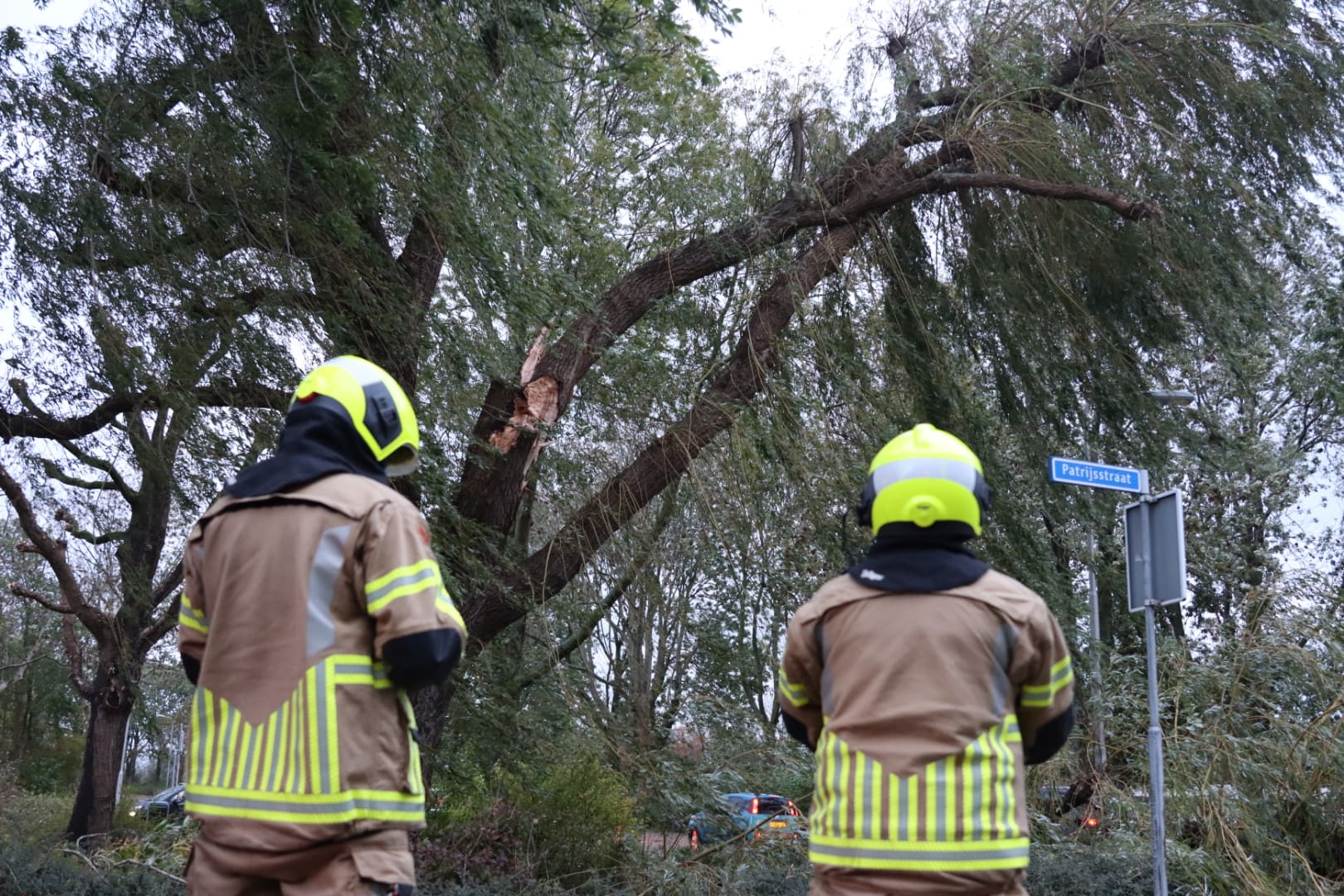 Een tak is donderdag eind van de middag afgebroken uit een boom langs de Uitermeer in Lisse. Daardoor kwam een grote tak los te hangen. Deze leunt op een andere tak. De brandweer heeft de weg afgezet.