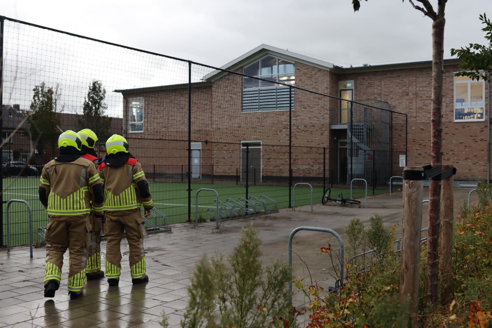Op het dak van het Kindcentrum Andreas in Voorhout zijn door de storm losse delen ontstaan. De brandweer zette het schoolplein af met linten.