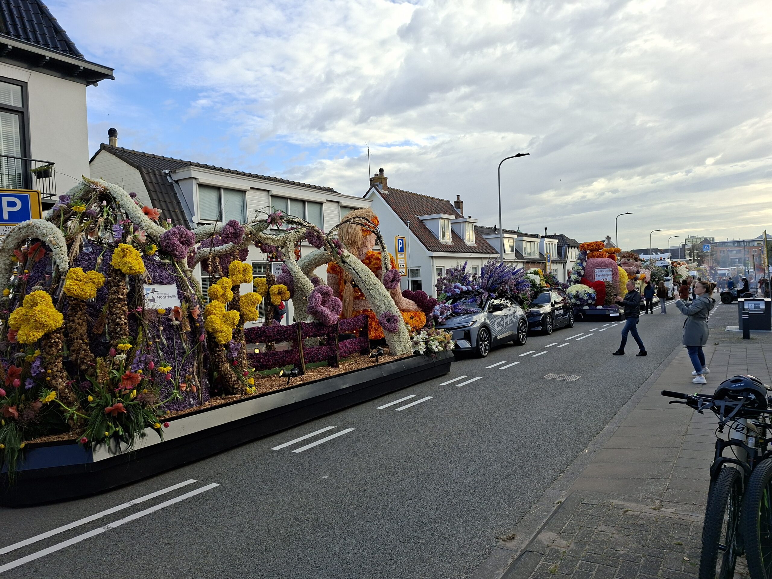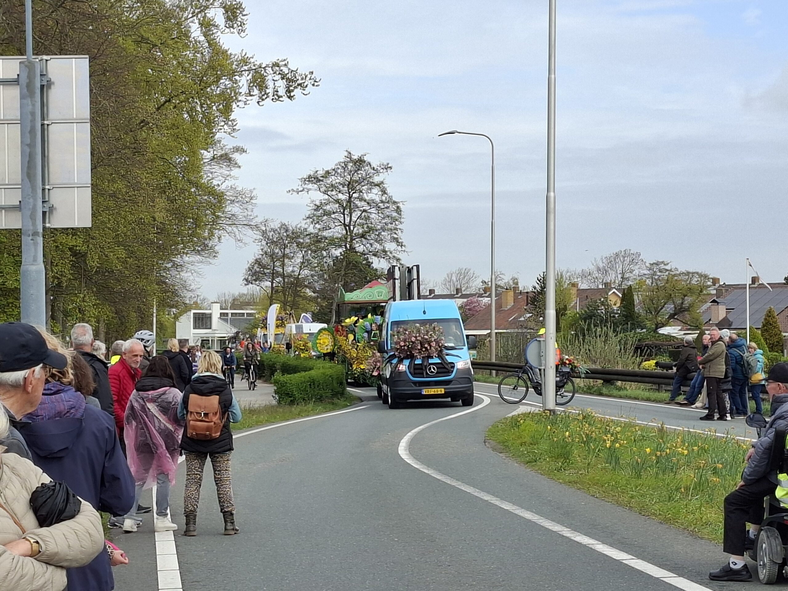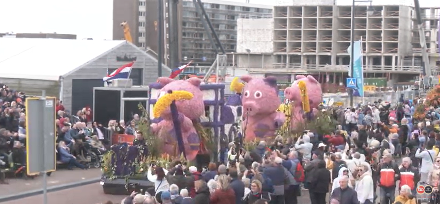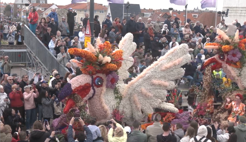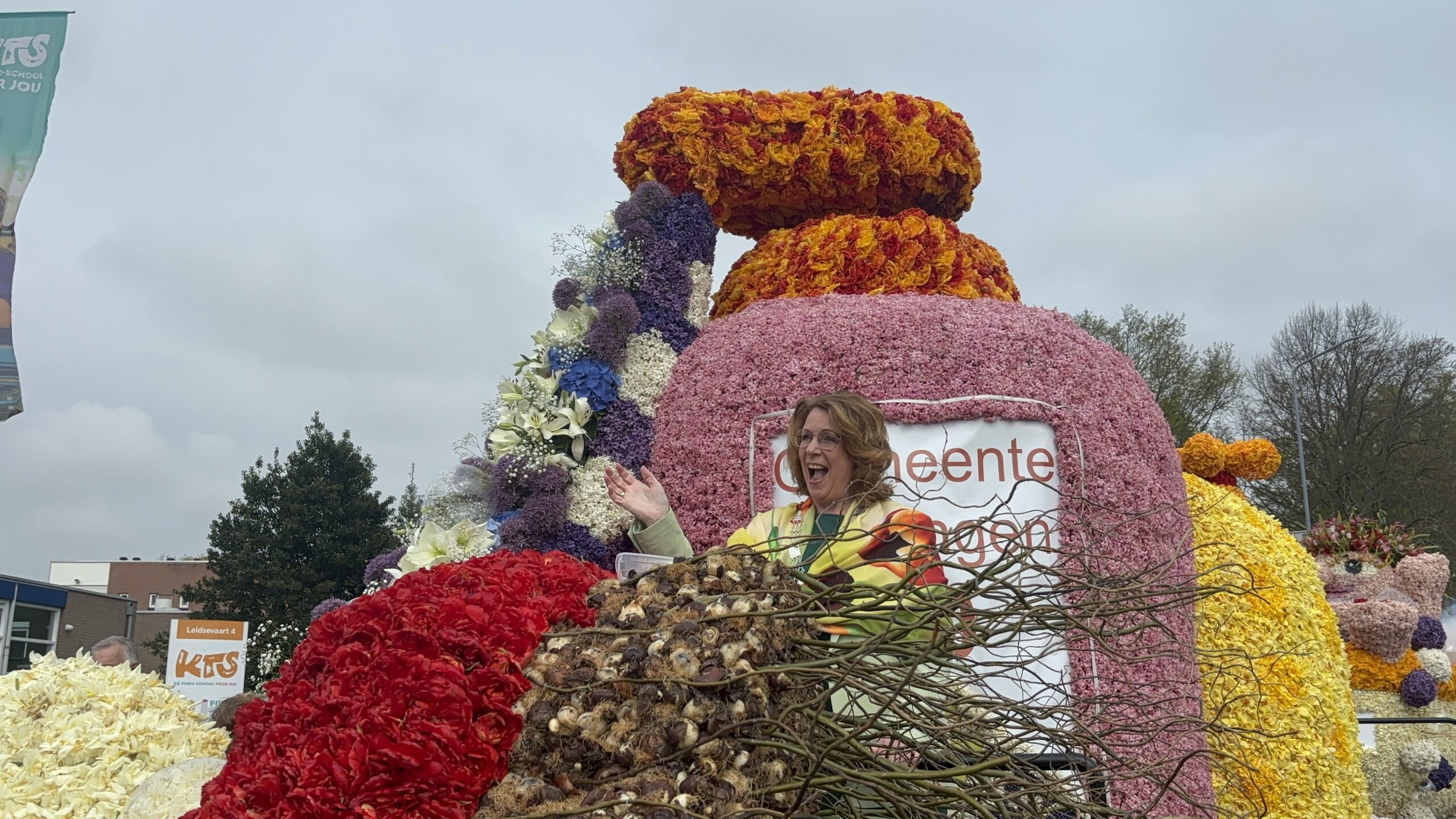 Daar is het Bloemencorso in Voorhout! De eerste wagens rijden langs de middelbare school KTS. De burgemeester van Teylingen, Carla Breuer, zal daar opstappen om mee te rijden. Tot nu toe rijdt het Bloemencorso keurig op schema: de inschatting was dat de eerste wagens om 10:55 uur langs de KTS zouden rijden.