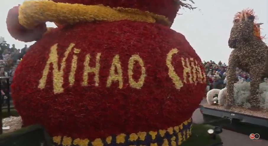 Het Bloemencorso trekt jaarlijks veel bezoekers uit China. Het Chinees Cultureel Centrum uit Den Haag speelt daar op in met een corsowagen. ‘Nihao China’ staat er op de zijkant.