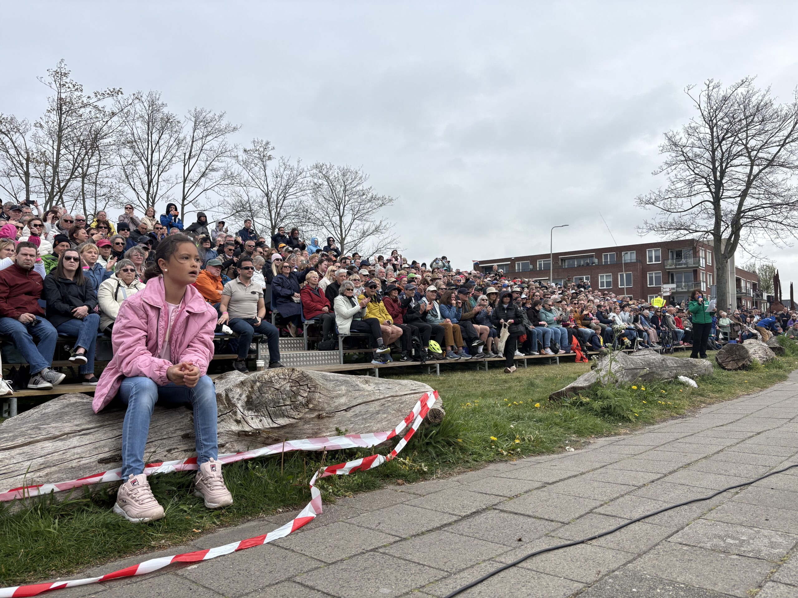 Het Bloemencorso trekt door Voorhout, ook daar is het druk. De tribunes, speciaal opgezet voor het Bloemencorso, zitten propvol. Er is geen stoel meer vrij: de boomstammen worden ook maar gebruikt om op te zitten.