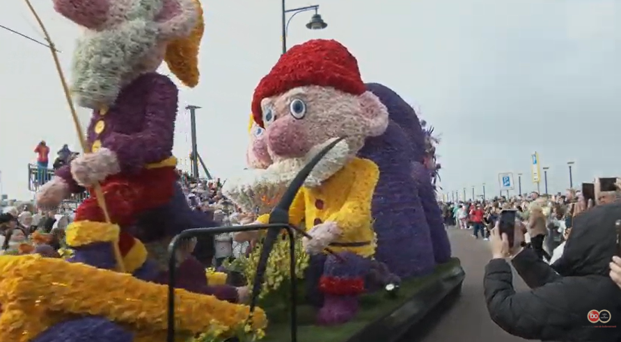 De bezoekers op het Vuurtorenplein klappen voor veel wagens die langskomen. Dat gebeurt ook voor de wagen ‘Er was eens…’ van stekersgroep Hillegom-Haarlem. De zeven dwergen zijn te zien, de heks kijkt de vele bezoekers op de Koningin Wilhelmina Boulevard nog eens na.