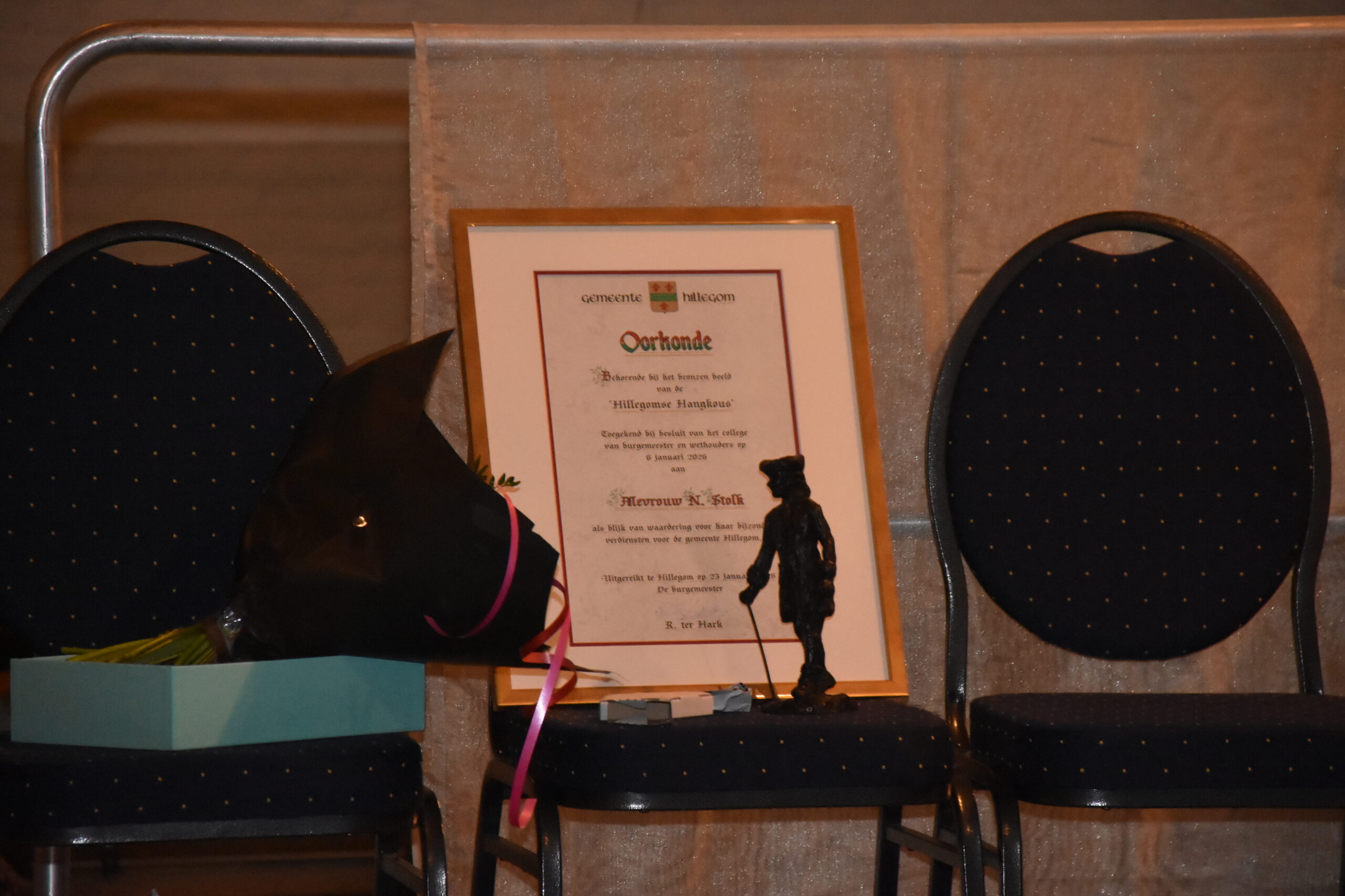 De Hangkous werd uitgereikt door burgemeester Roberto ter Hark en wethouder Karin Hoekstra. Stolk was namelijk in die veertien jaar als directrice vaak vrijwillig actief als organisator achter Hillegomse evenementen, zoals het Zomerfestival, Hillegom Romantique, het ‘meezing café’ en allerlei activiteiten die te maken hadden met het Cultureel Najaar in Hillegom.
