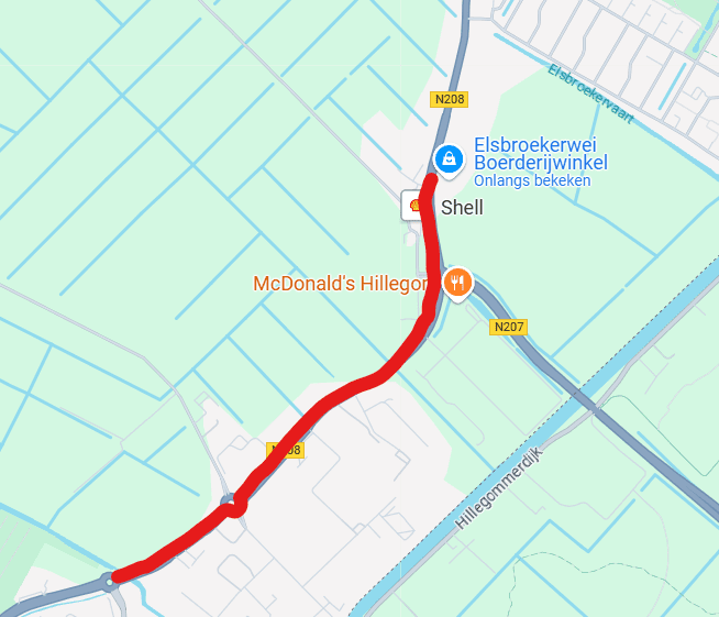 De weg gaat dicht tussen de rotonde van de N208/Heerweg in Lisse tot aan de Elsbroekerwei Boerderijwinkel in Hillegom. Daardoor is ook de splitsing bij de McDonald’s in Hillegom afgesloten.
