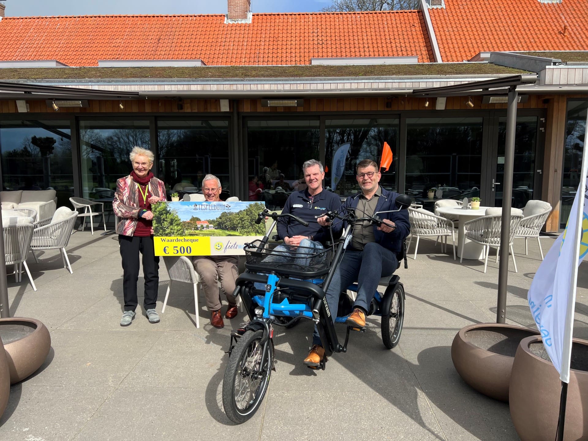 Tespelduyn heeft Fietsmaatjes een cheque overhandigd van 500 euro. Hiermee kunnen de duofietsen worden onderhouden.