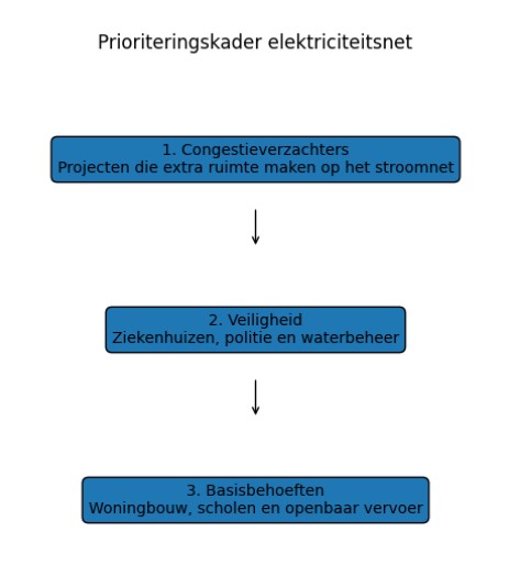 Woningbouw valt onder de categorie basisbehoeften. Dat betekent dat nieuwe huizen belangrijk zijn, maar niet de hoogste prioriteit krijgen. Projecten die het stroomnet direct ontlasten of zorgen voor veiligheid, zoals ziekenhuizen en hulpdiensten, gaan voor.