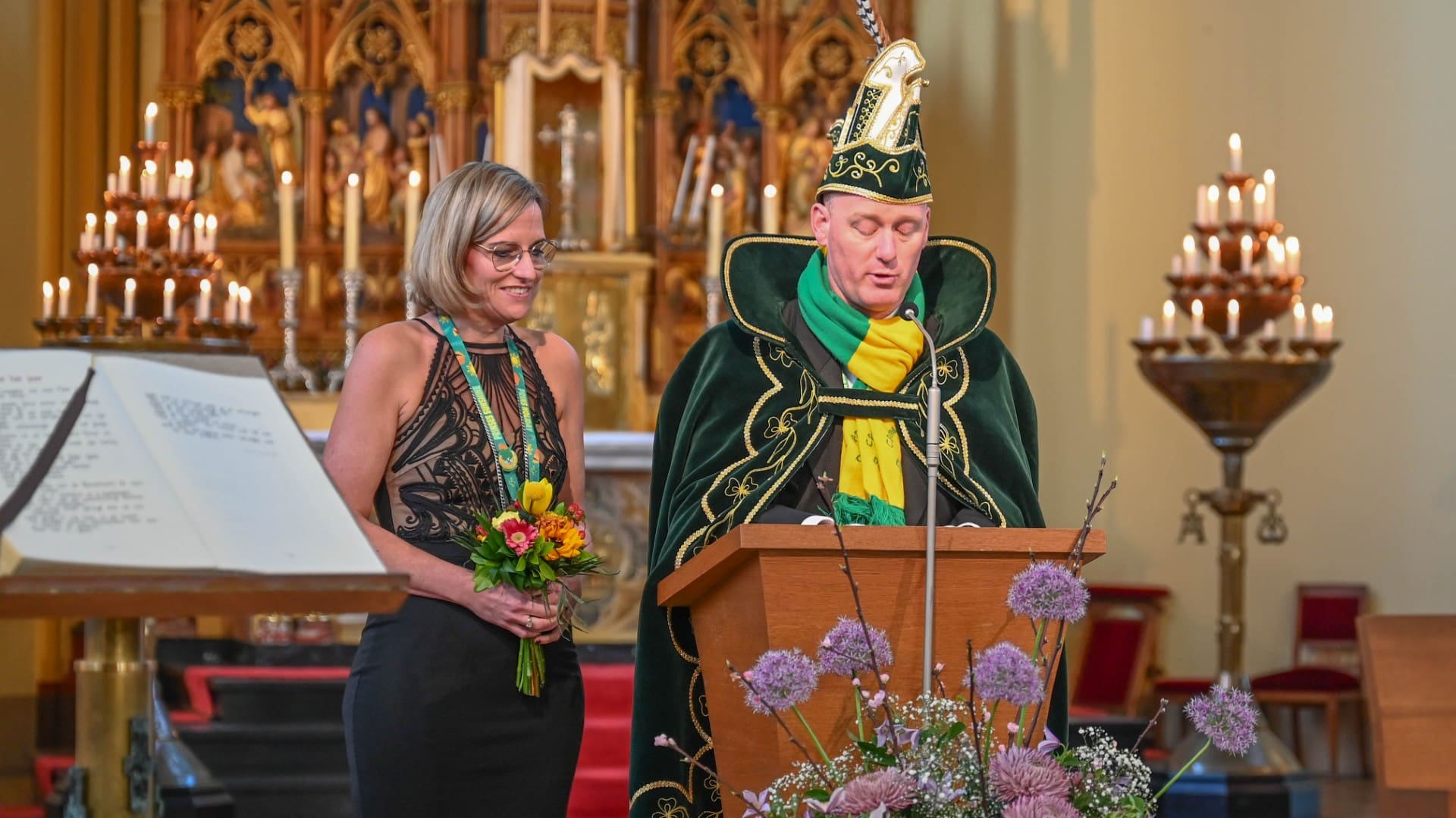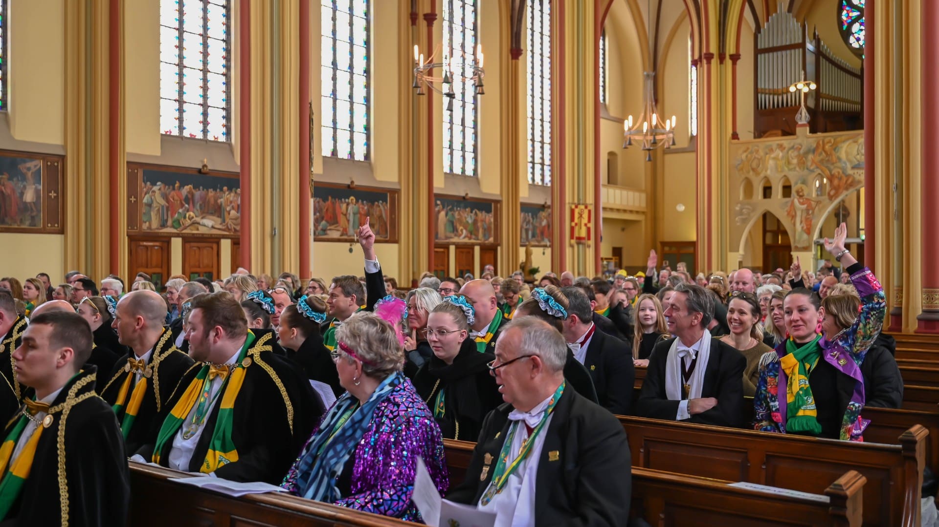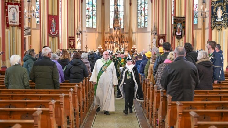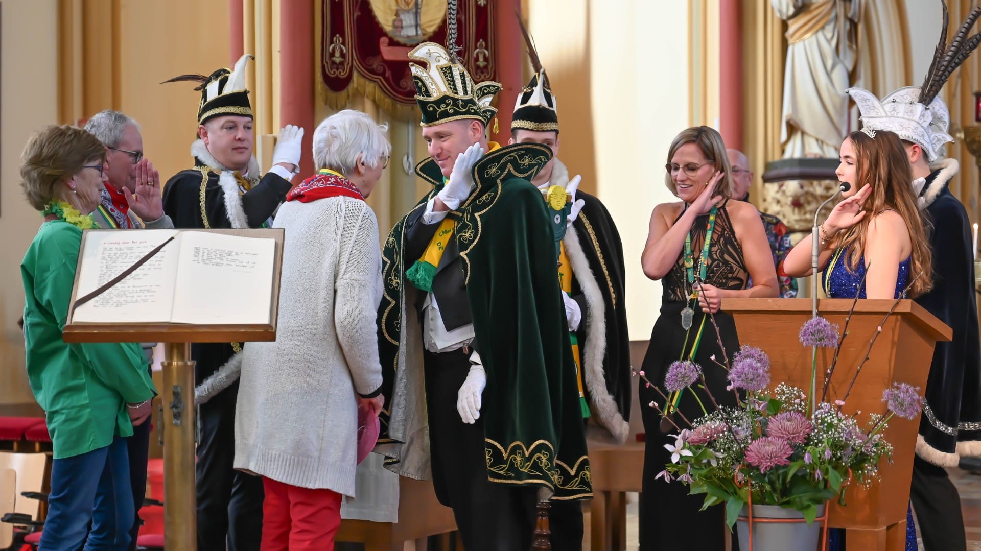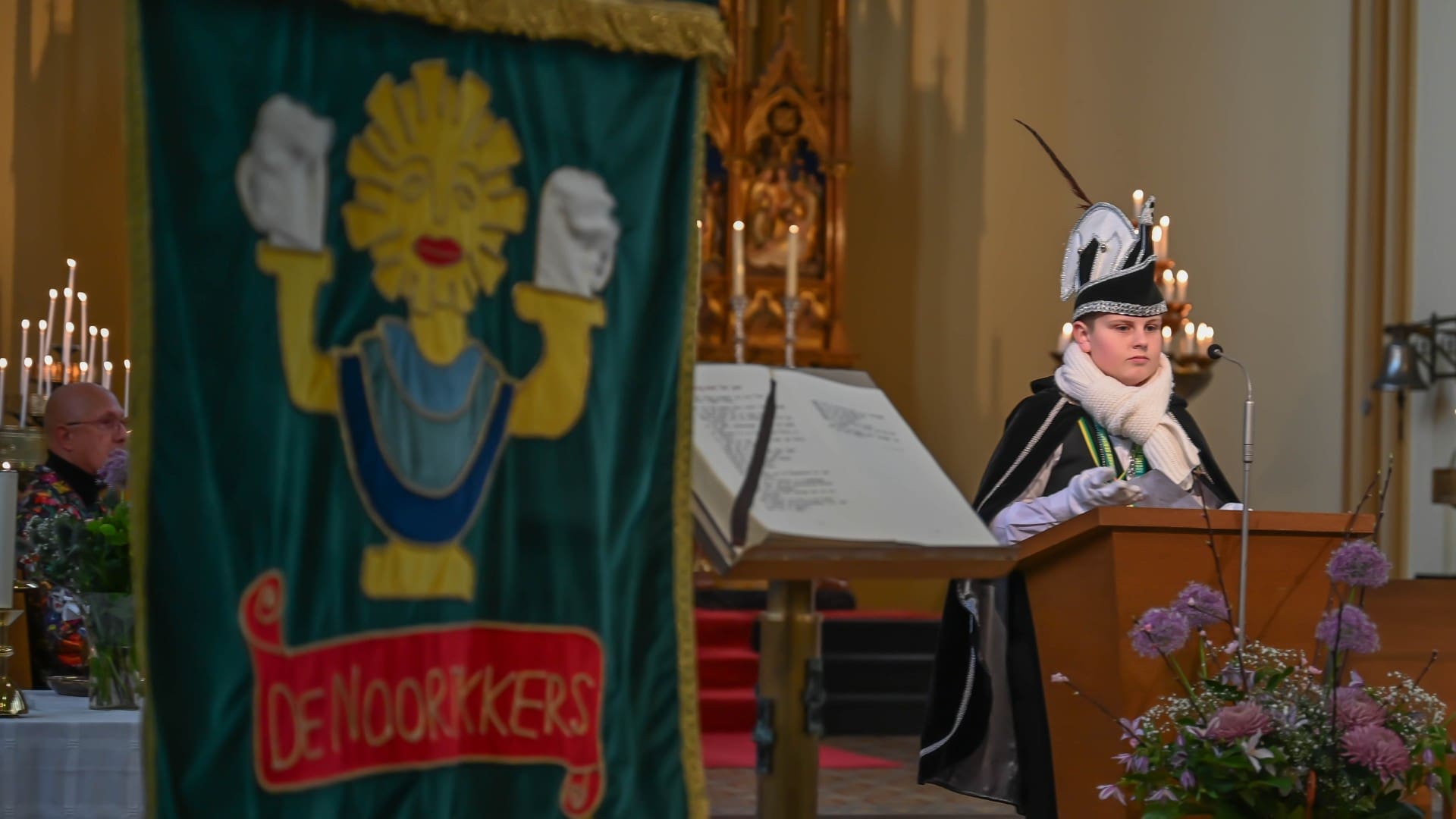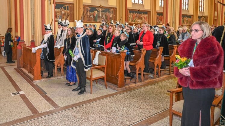 Noordwijk – Het prinsenpaar der Noortukkers was met een groot gevolg zondag aanwezig bij de carnavalsviering in de RK St. Jeroenskerk. Voordat de feestelijkheden losbarsten heeft carnavalsvereniging De Noortukkers ieder jaar een moment van bezinning in de kerk.