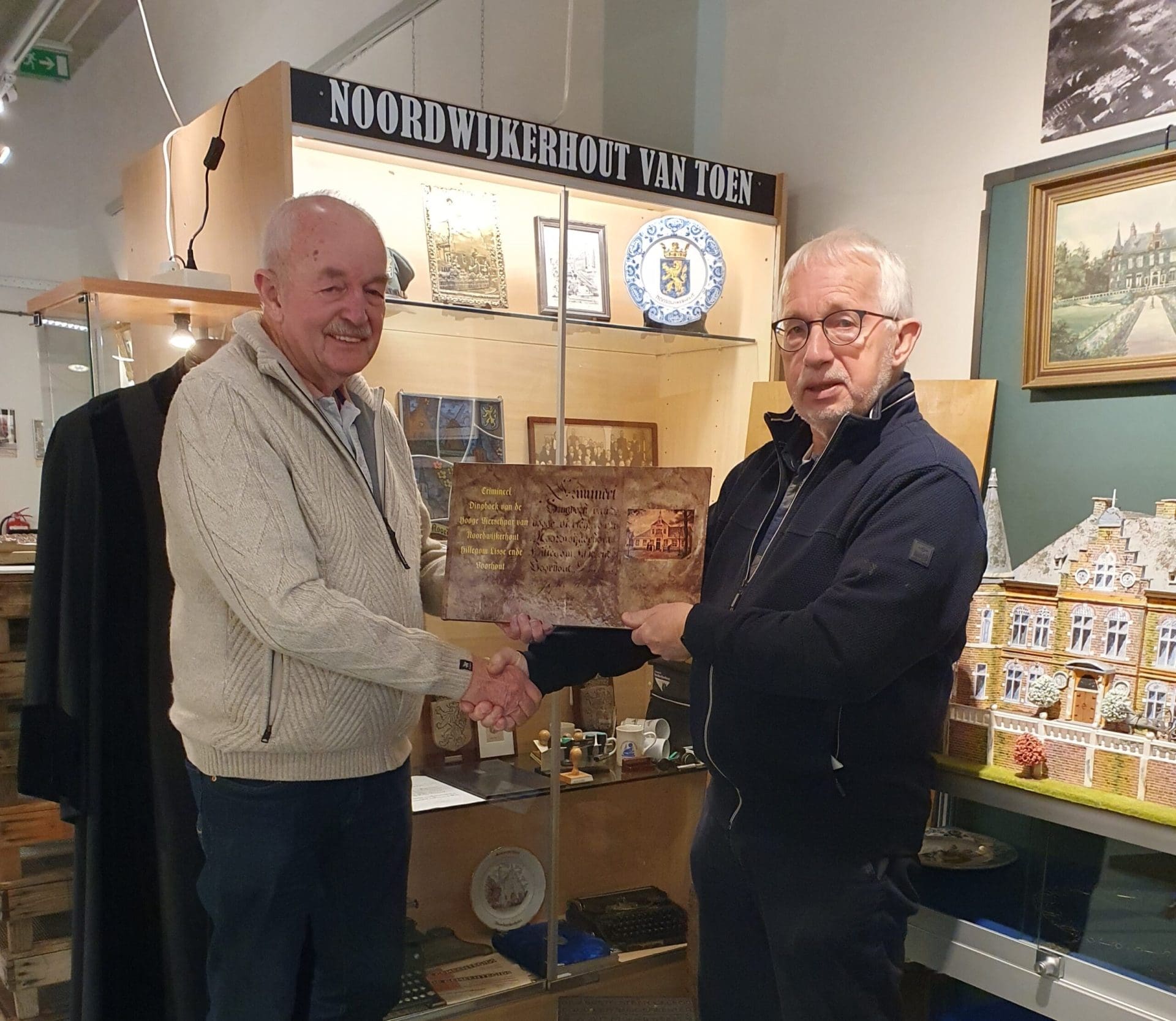Auteur Chris van der Klugt (l) overhandigt het eerste exemplaar aan NoVaTo-voorzitter Abe Bader (foto: NoVaTo).